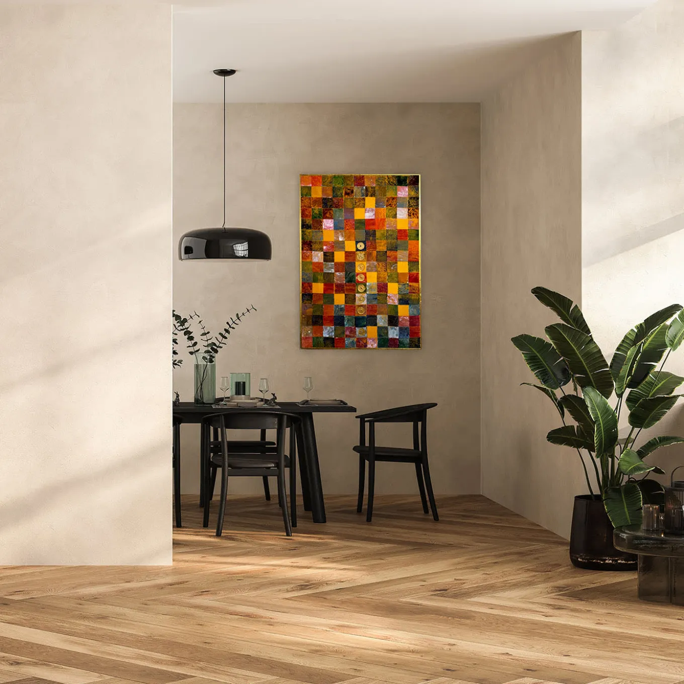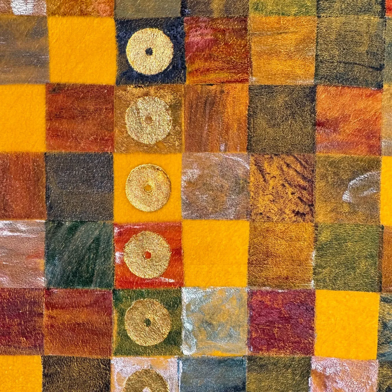 This tapestry features a painstaking technique combining natural yellow pigment dyeing with vivid colored pastes, resulting in a deep, intense chromatic effect. The artist’s unique method imparts a sophisticated three-dimensional texture. Embellished with Murano glass paste details and gold leaf, this piece is encased in a delicate golden wooden frame that enhances its structure and elegance.