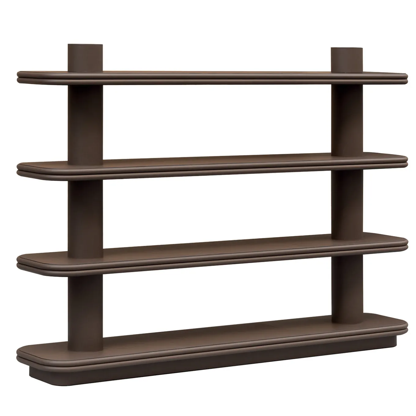 Entirely wrapped in soft brown nappa leather, this sophisticated bookcase is an exercise in balanced volumes and geometric harmony. The perfect place to showcase your favorite books and prized collectibles while adding visual interest to the interior, this freestanding bookcase stands tall on a plinth base and features a grid design with two vertical supporting poles intersecting three shelves. Available only in printed calfskin, nappa, and suede.