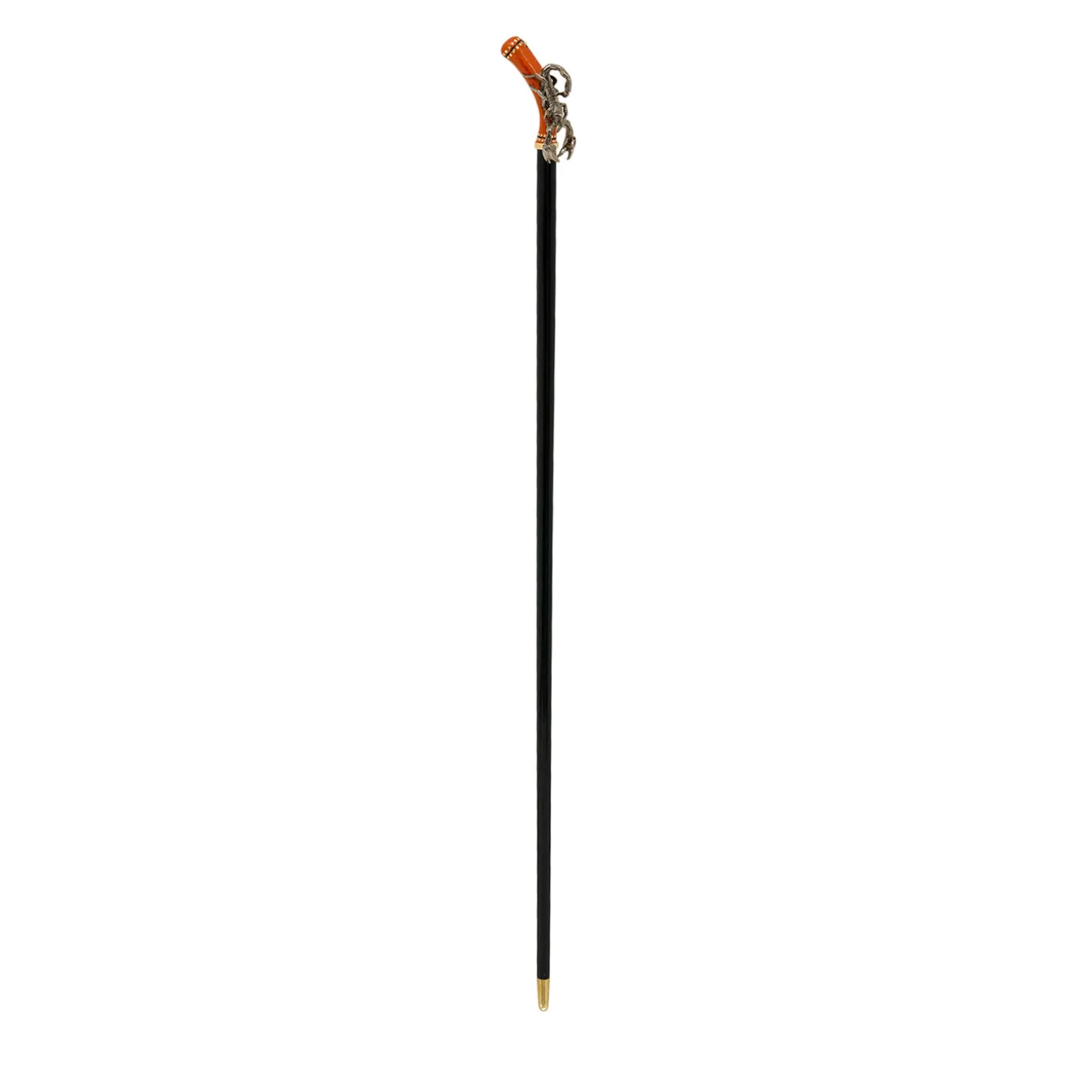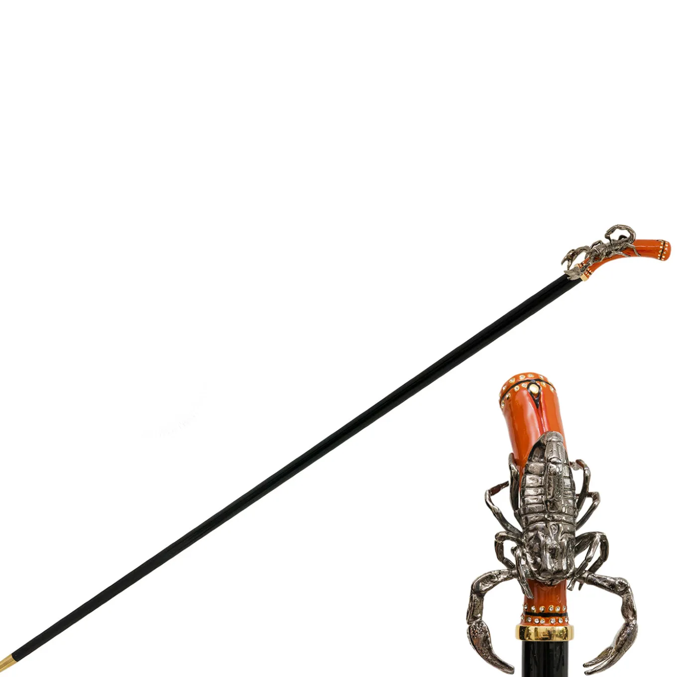 This walking stick features an enameled brass handle uniquely shaped like a scorpion, complemented by a smooth wood shaft. It measures 92cm and it includes a brass end capped with rubber for added durability and grip. The design combines distinctive aesthetics with functional support.
