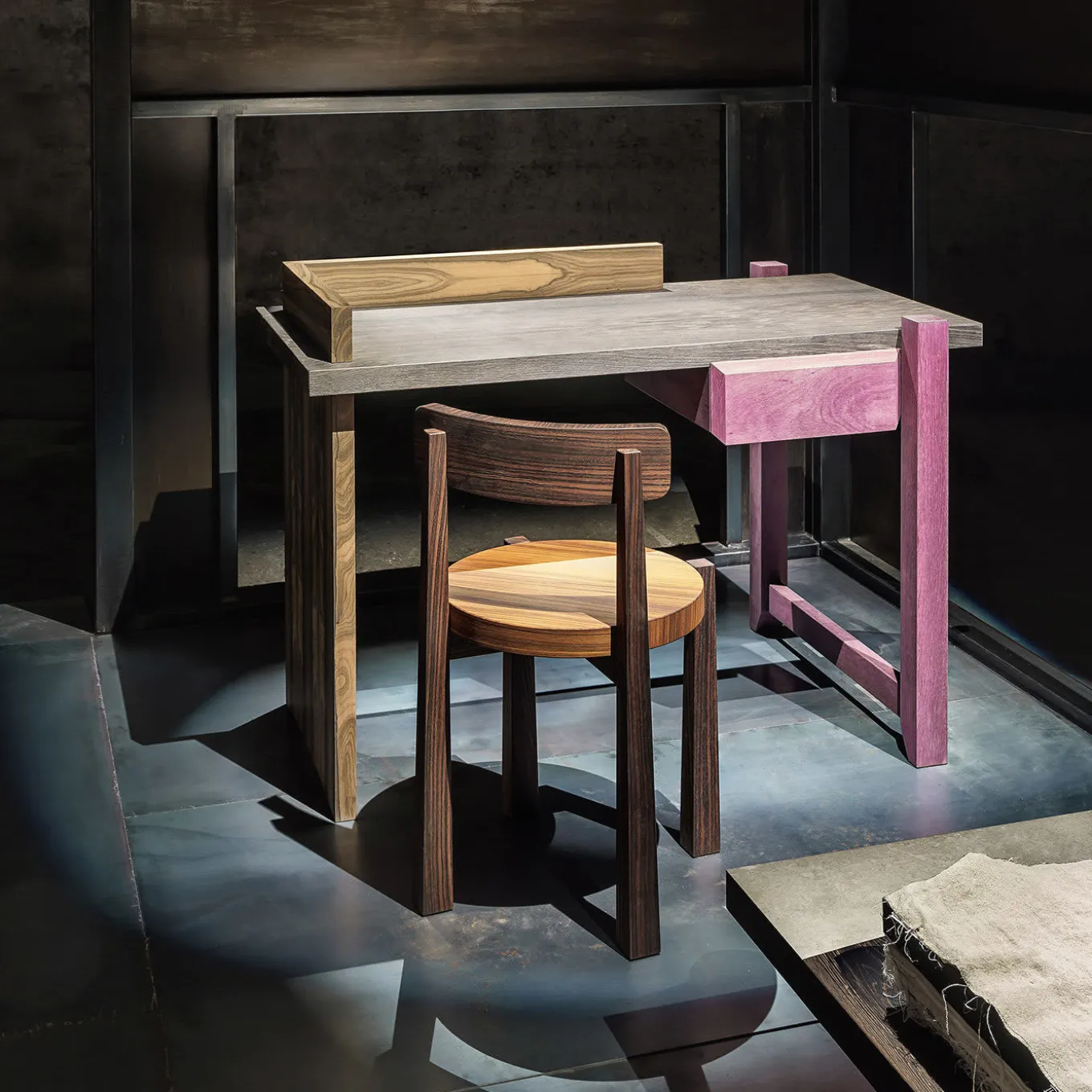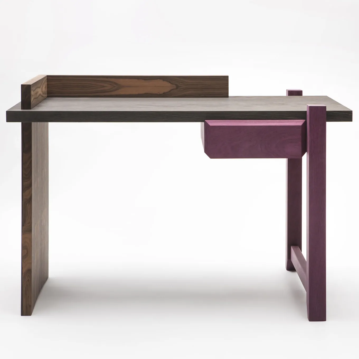 An exquisite combination of masterful traditional craftsmanship and refined materials, this writing desk of the Una Stanza (“a room”) series is entirely fashioned of Ziricote, a visually striking and exotic wood known for its natural spiderweb grain pattern, and its dark shades enhanced with purple tones. The desk parts intersect elegantly to create the unique design which is supported by a solid panel on one side and an open leg on the other.