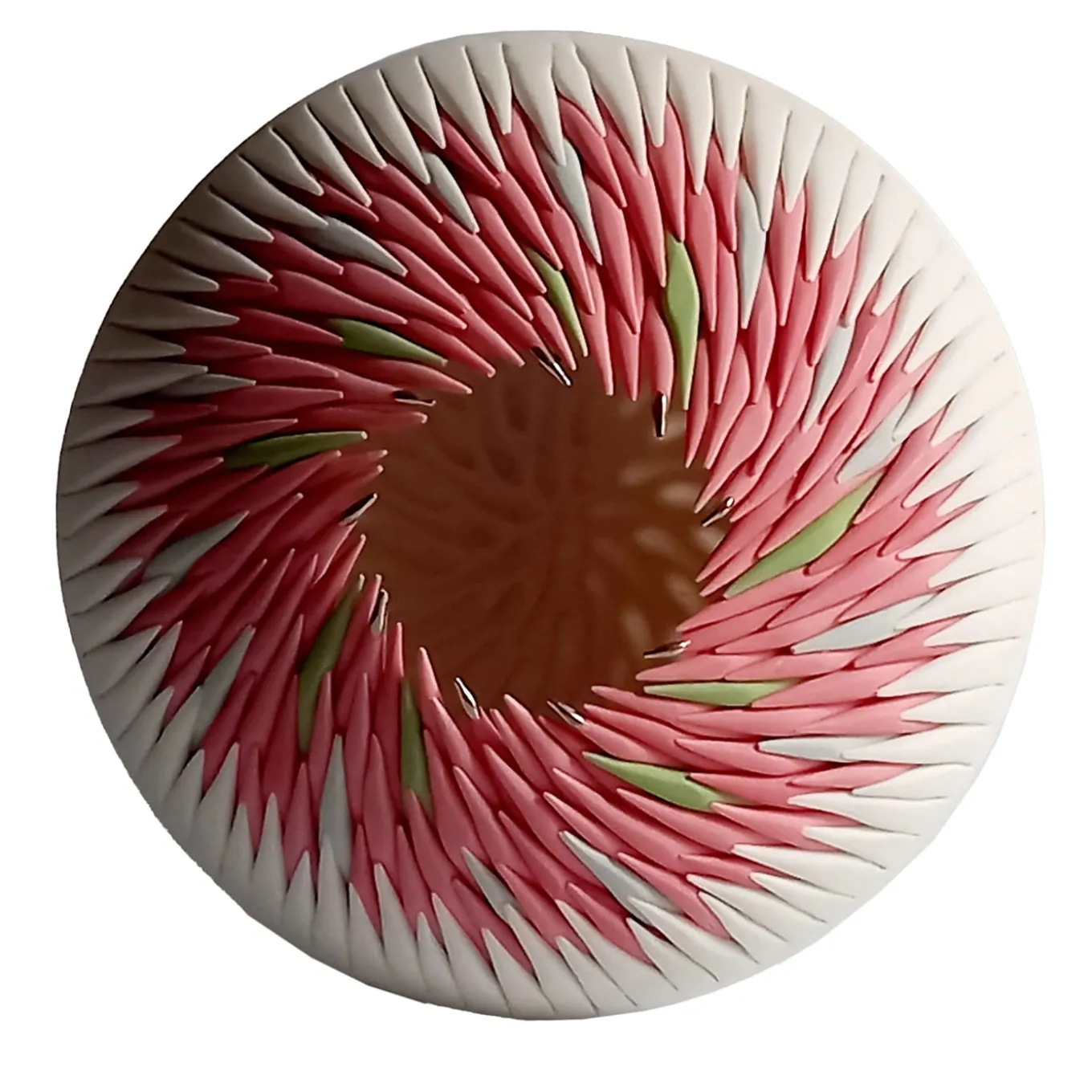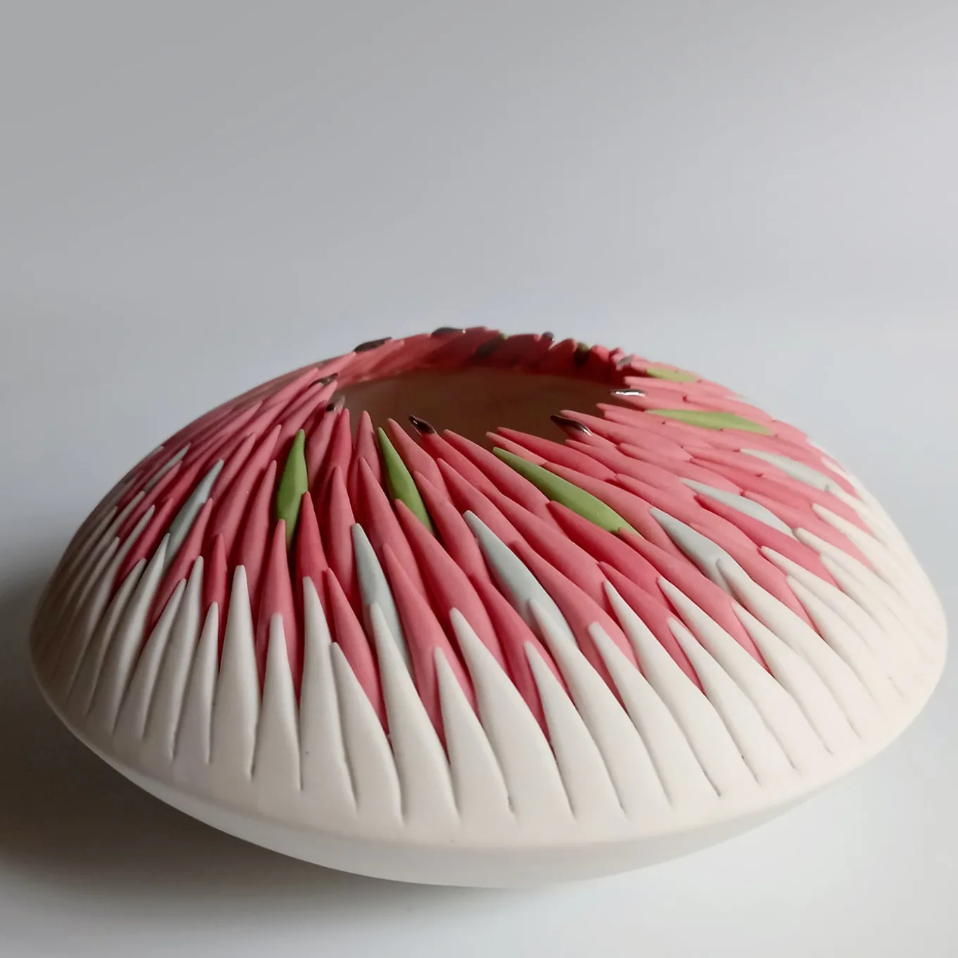 Sea Urchin is a sculpture that is part of the wall collection. This series is conceived to create groups of pieces of different diameters, colors, and designs, forming an installation of great visual effect for all spaces. Custom composition, variety of colors and gradations, and plus, gold and platinum finishes available. Possibility of acquiring single sculptures and using them as centerpieces. They are handmade positioning leaf by leaf of colored porcelain with great accuracy.