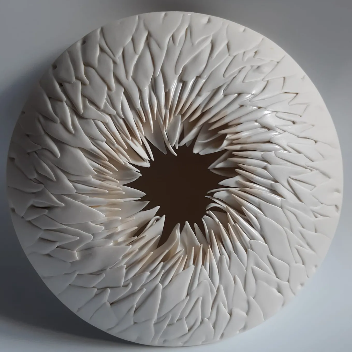 Sea Urchin is a sculpture that is part of the wall collection. This series is conceived to create groups of pieces of different diameters, colors, and designs, forming an installation of great visual effect for all spaces. Custom composition, variety of colors and gradations, and plus, gold and platinum finishes available. Possibility of acquiring single sculptures and using them as centerpieces. They are handmade positioning leaf by leaf of colored porcelain with great accuracy.