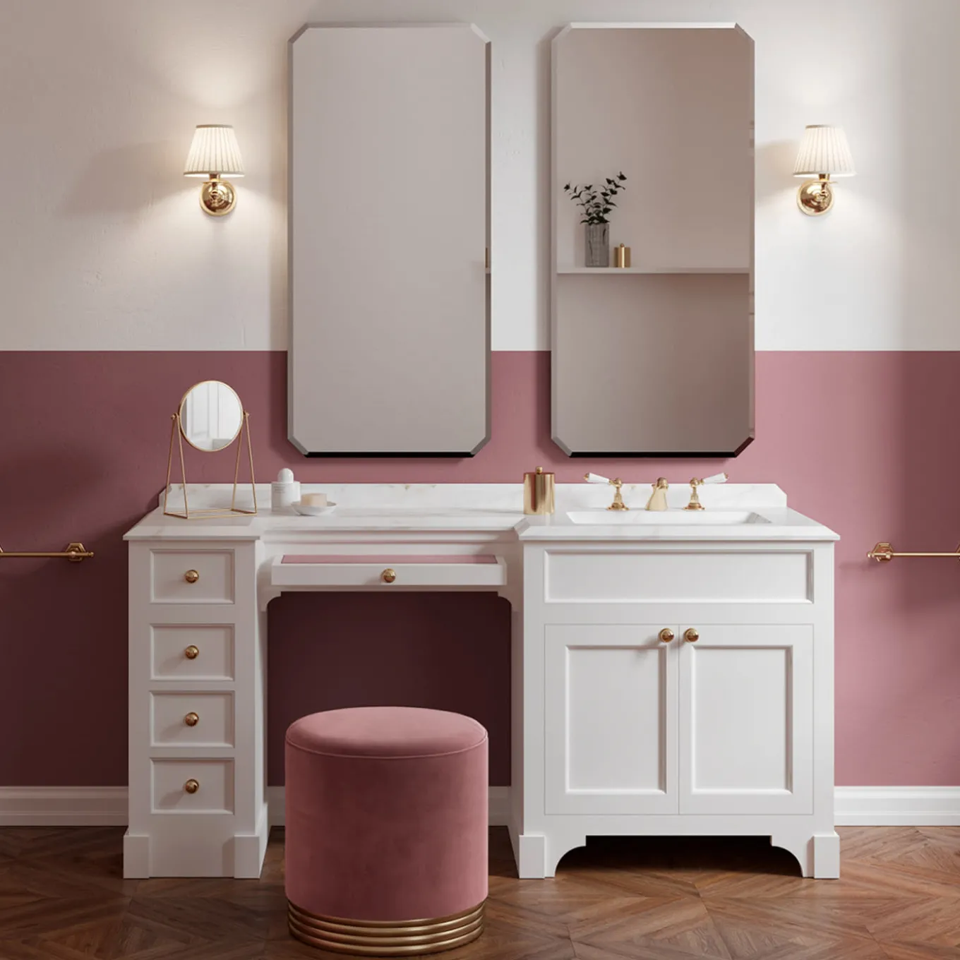 The iconic neoclassical vanity unit features a dressing table with four drawers and a fold-out velvet top. Ideal for those wanting to make even the most compact space into an exclusive, luxurious beauty haven, Season Vanity is the result of impeccable craftsmanship and the finest materials. Available in different finishes upon request. Please, contact the Concierge service for further information. Faucets are not included.