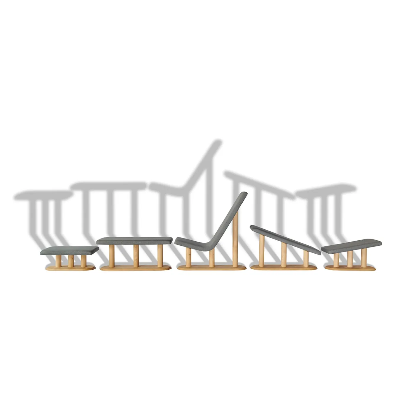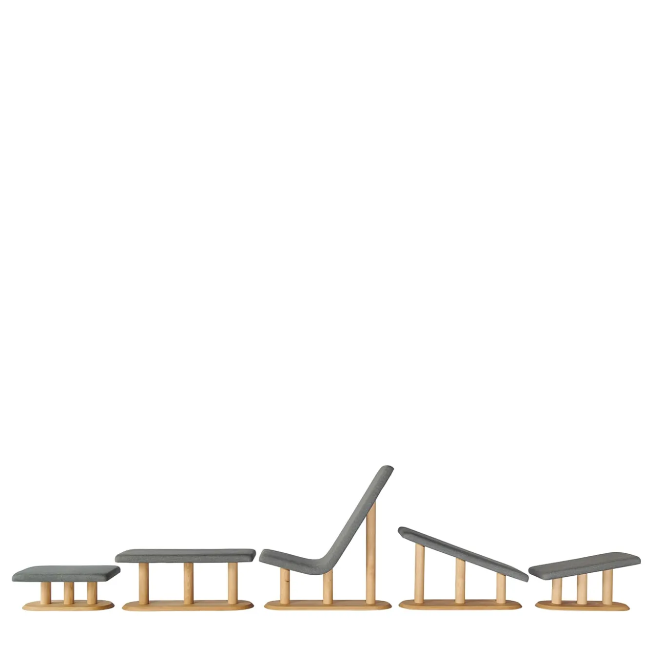 An astonishing set of multifunctional, minimalist pieces by designers Lanzavecchia-Wai, where essential lines and forms sustain multiple possibilities to chill or get comfortable. Crafted in Italian chestnut wood and complete with polyurethane padded seating and chic grey cotton fleece upholstery, this set will make an elegant impact in any contemporary space, contract and residential alike. Please ask the Concierge for more details. Designer: Francesca Lanzavecchia and Wai.