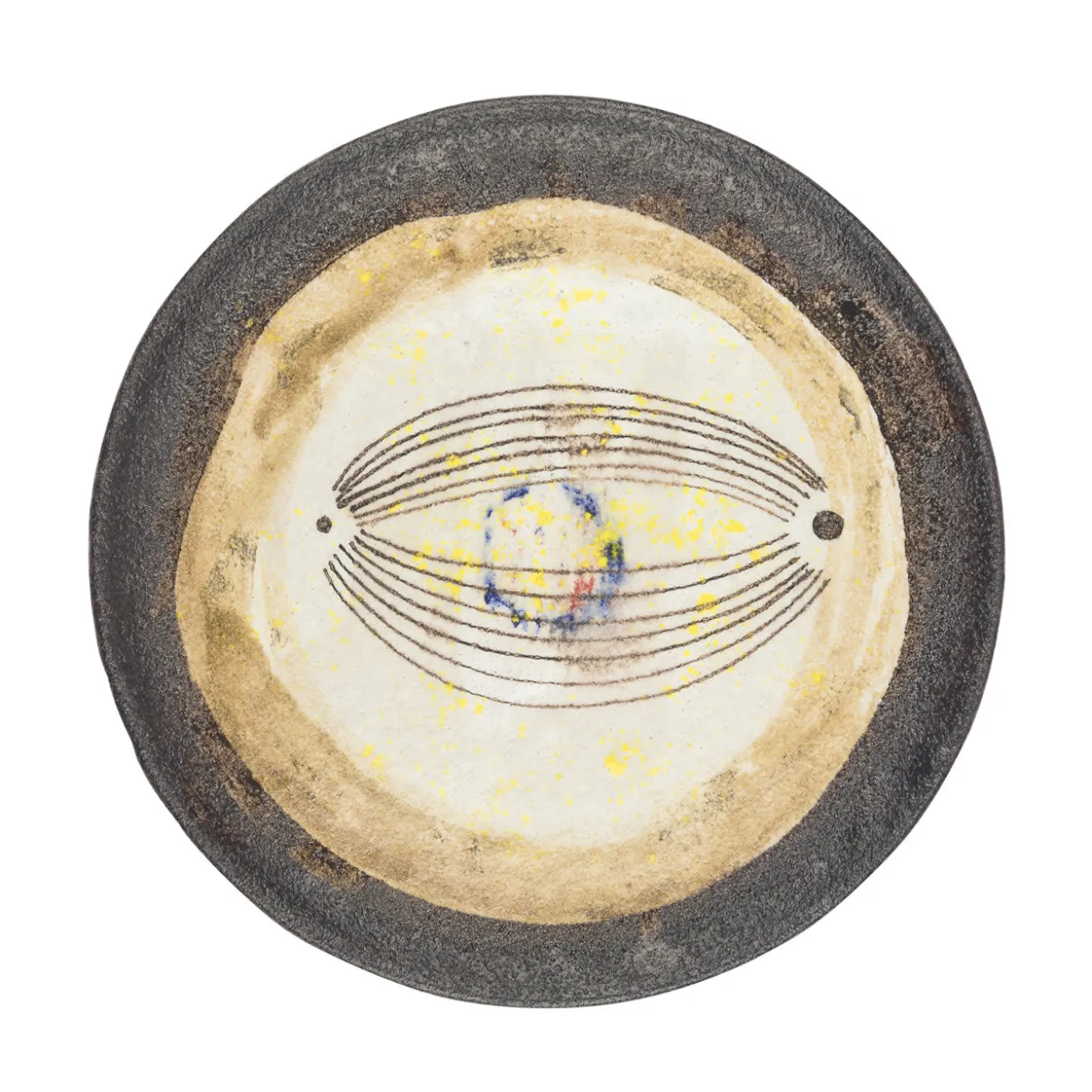 This plate, crafted by hand according to the age-old tradition of ceramic making of Vietri, by the Amalfi Coast, features a glazed enamel finish with abstract decorations featuring warm colors ranging from brown to yellow and ochre with a stamp-like smudge of contrasting blue in the center. The effect is a striking mix of tradition and innovation. Also available in the d18 cm version.