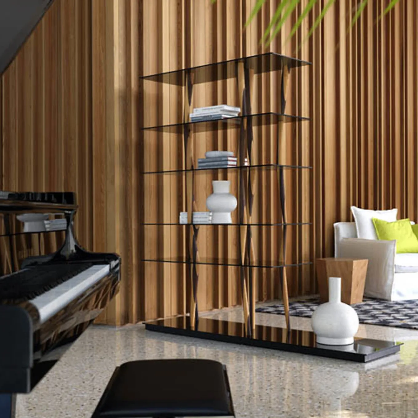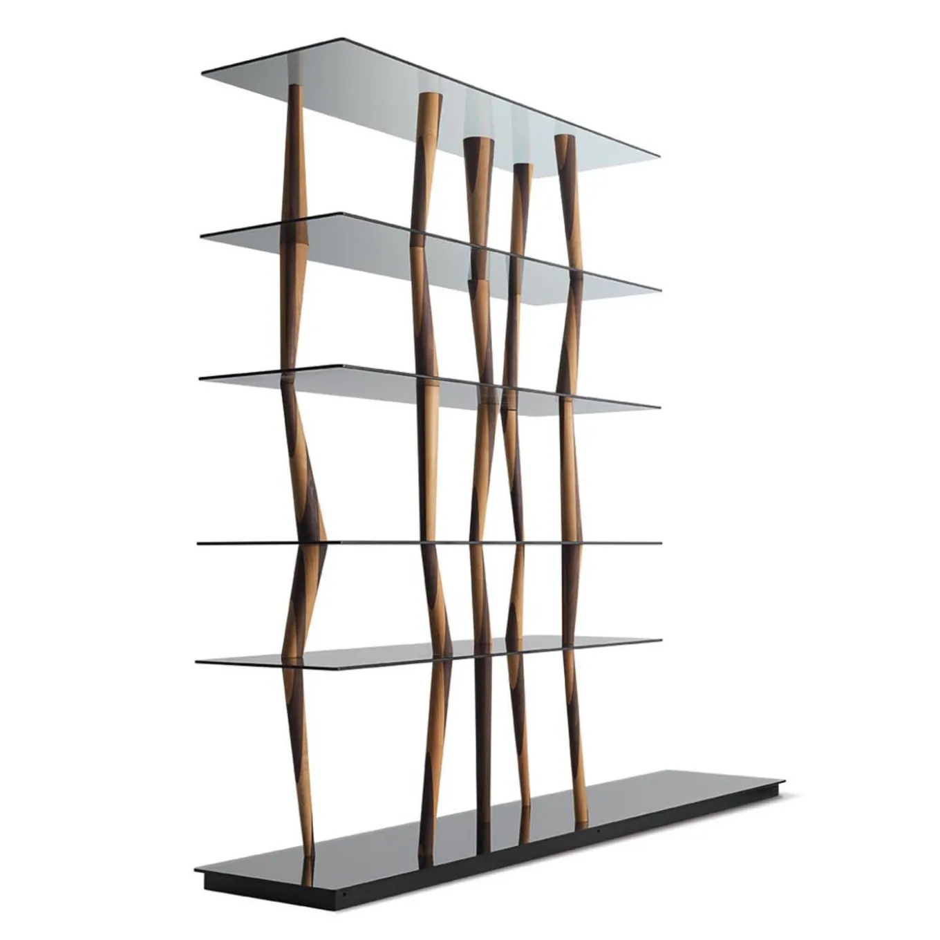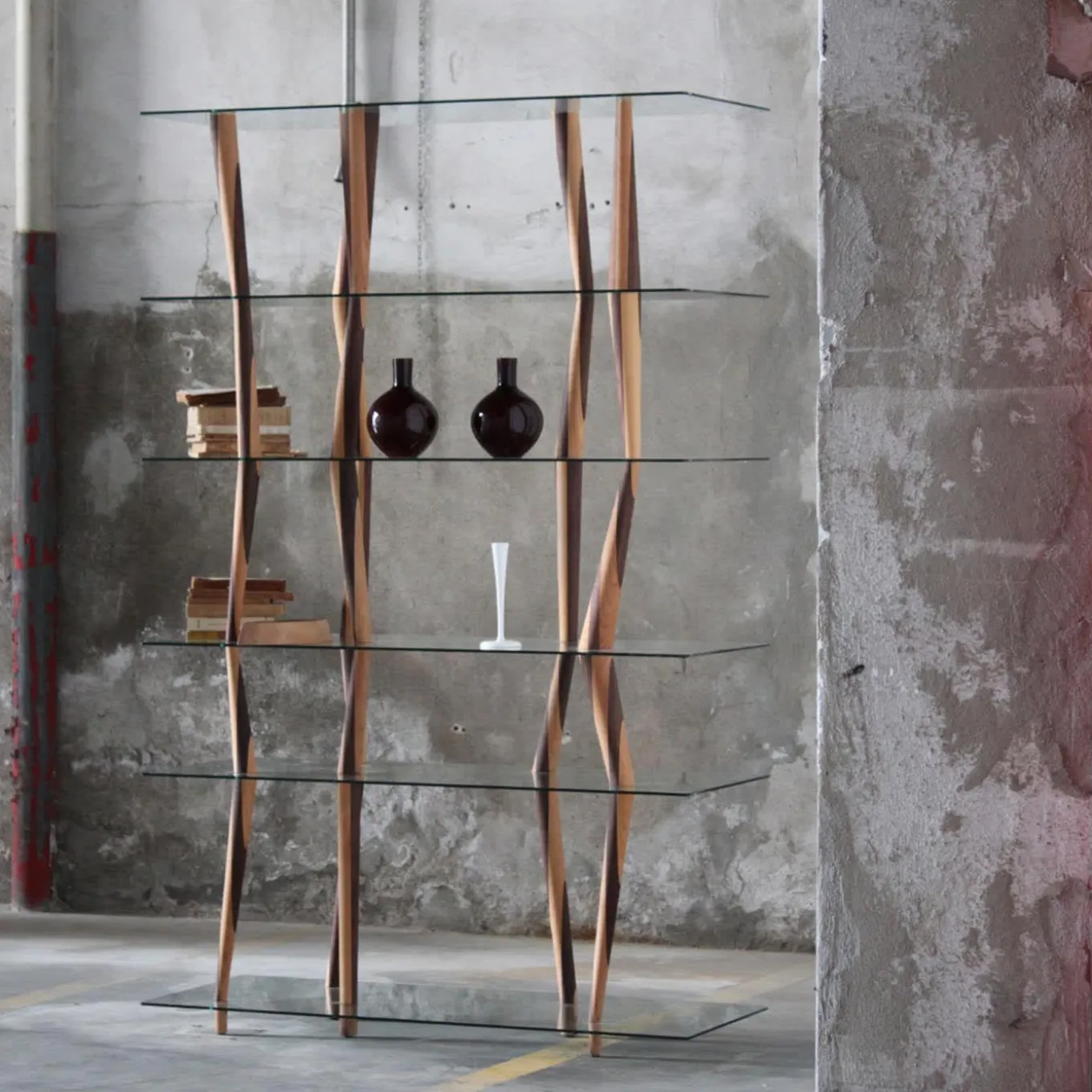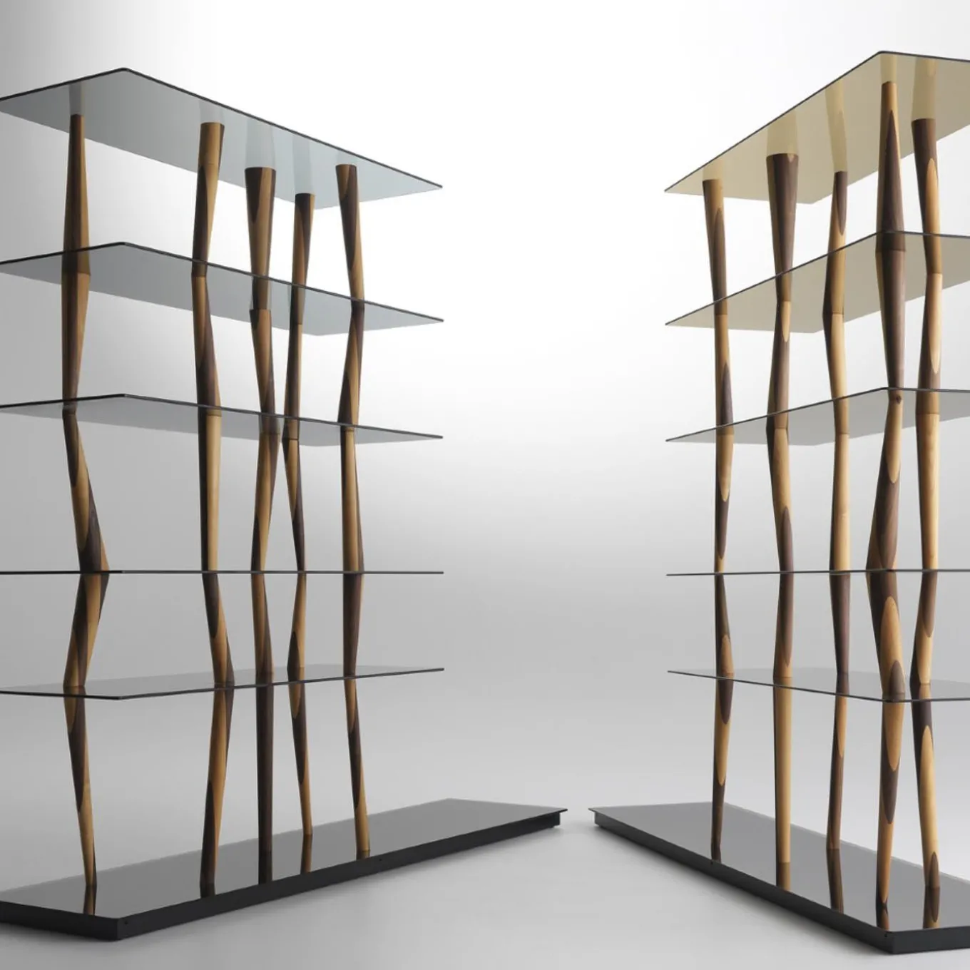 Named after the Japanese city of Sendai and exquisitely designed by renowned artist Toyo Ito, this striking bookcase features a dynamic and captivating silhouette boasting a strong emotional power. Superbly crafted, this sculptural piece comprises six light and delicate shelves (including the base) made of smoky tempered glass and connected with solid alder and walnut elements, gently curved in unique, natural shapes.