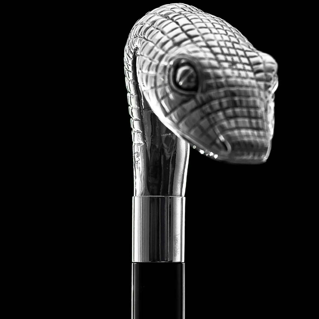 Characterized by an elegant and classic design, this stick features a metal handle richly decorated with elegant patterns embossed on the surface. The conical shaft of this sophisticated accessory is crafted in gloss black beech wood and has a silver-plated brass tip with protective rubber end. This is a collectible item, not to be used for walking.