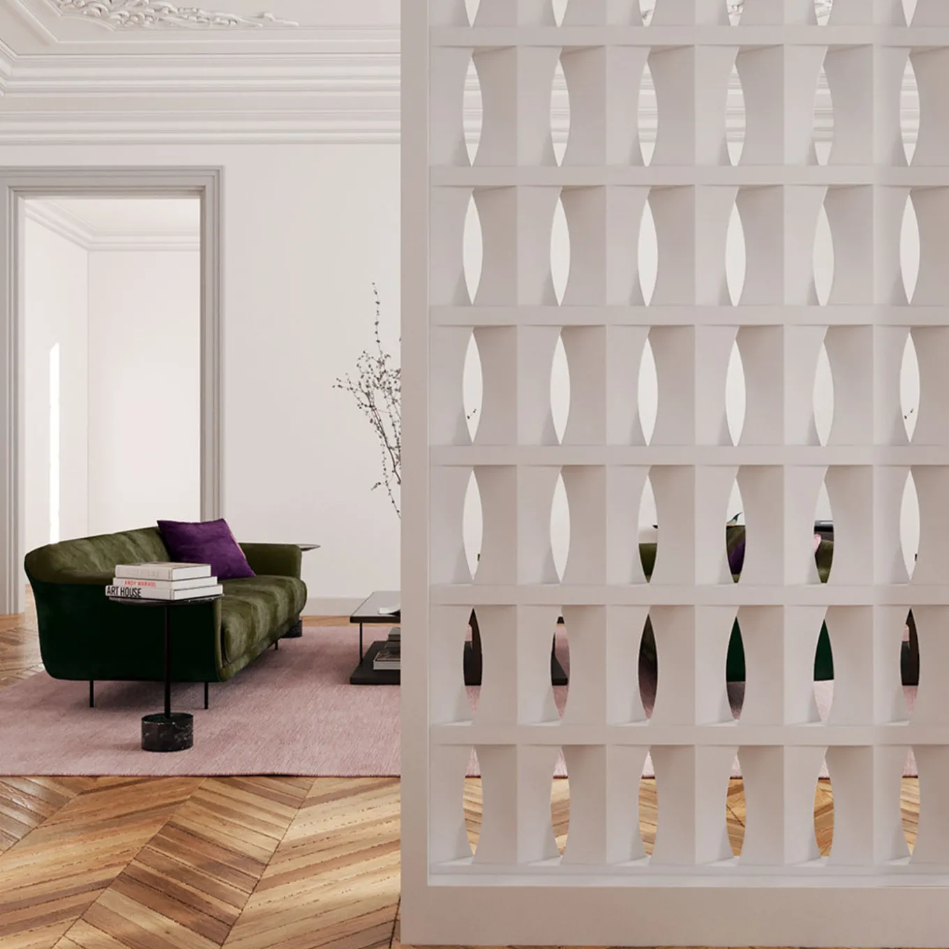 This screenblock was inspired by the bold lines of Oscar Niemeyer’s 1960s Brasilia. The blocks create partial partitions that allow visual continuity between spaces, combining complex curves with pure geometric forms. Engraved surfaces produce dynamic light and shadow effects, while open sections modulate spatial perception. Designed for stability on a raised base, they can be painted any color after installation and, with protective treatment, are suitable for outdoor use. The displayed price refers to the minimum order of 0.9 m² (3 packs of 5 blocks each).