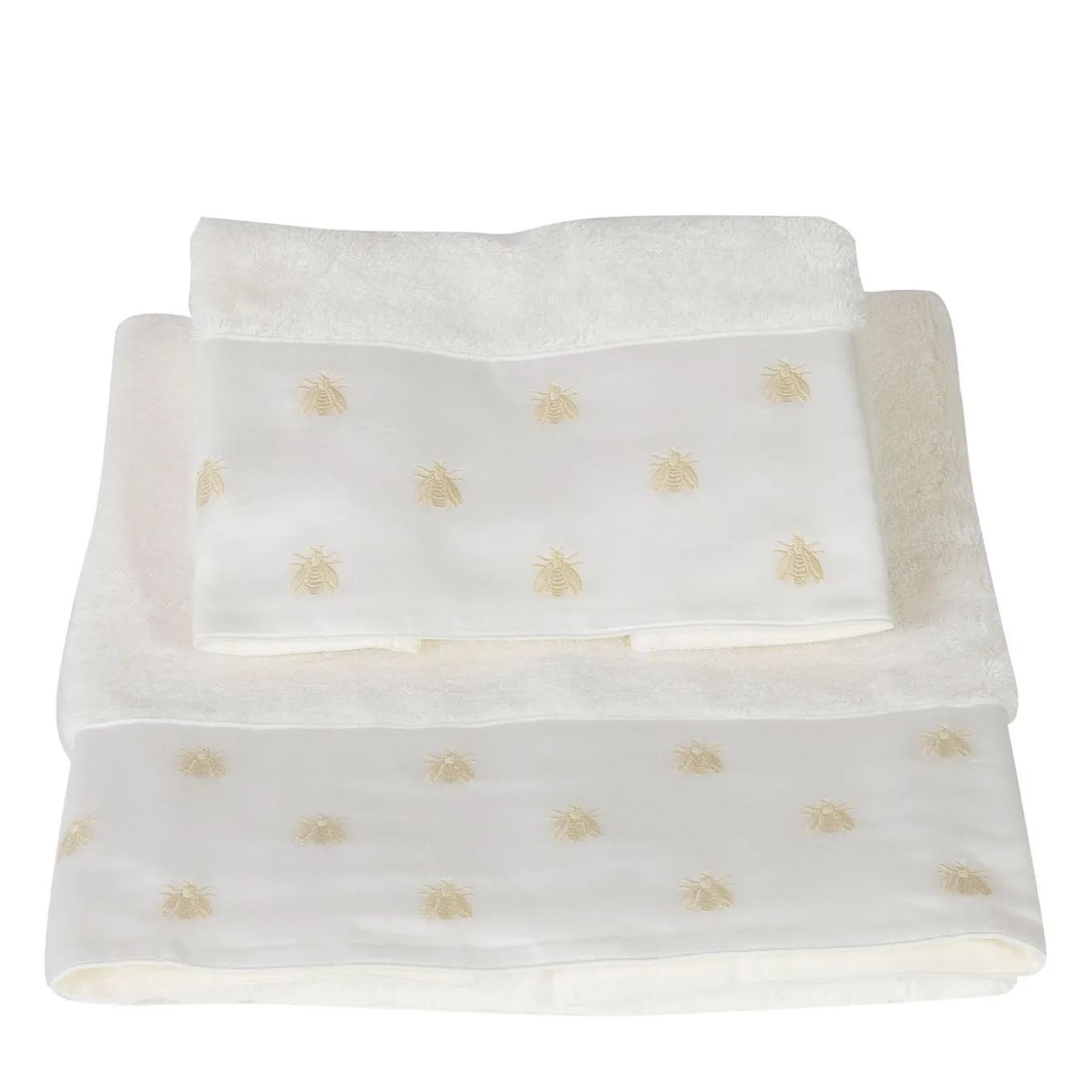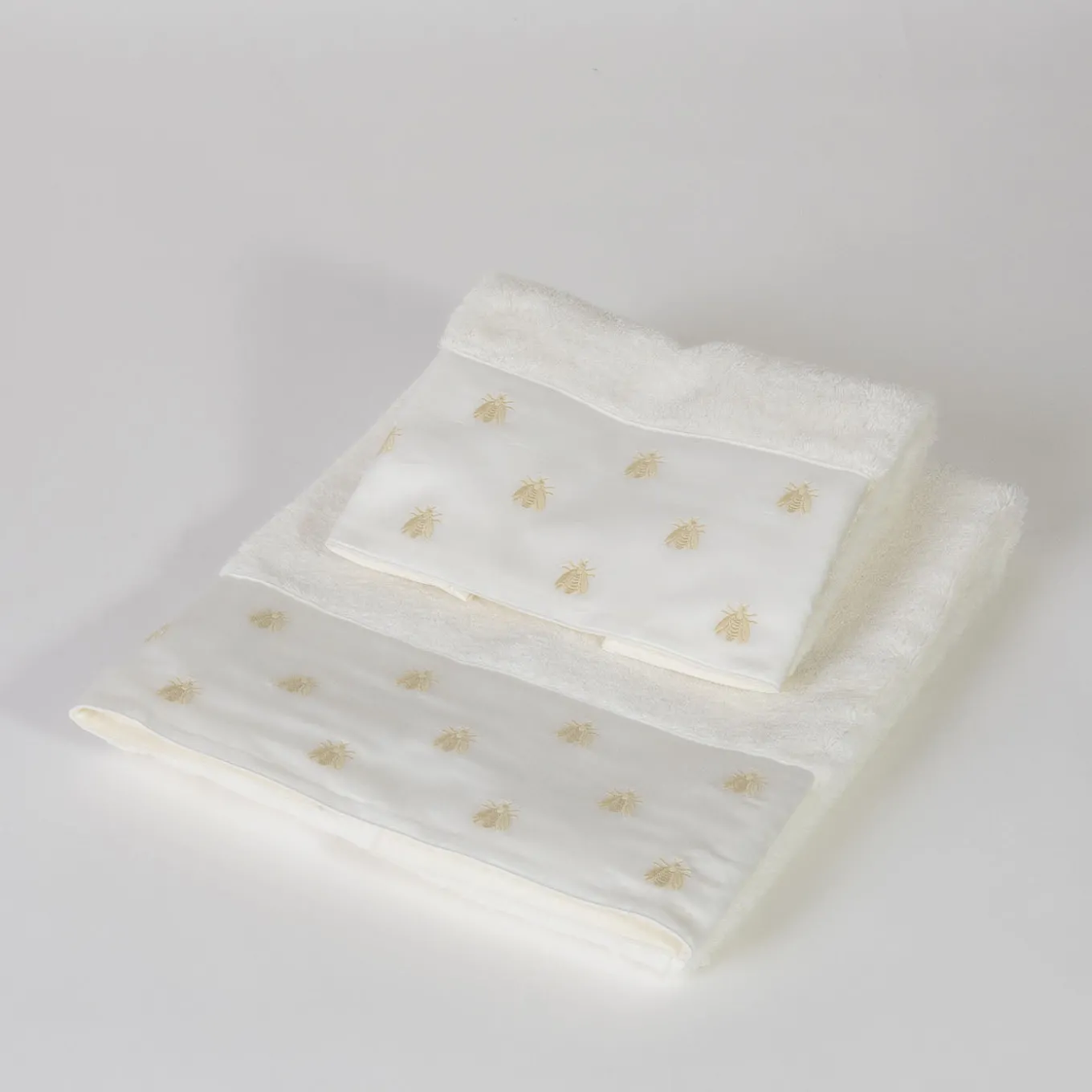 The Api Satin towel set includes two pieces in plush terry cotton, finished with an applied satin border delicately embroidered with the signature bee motif. A refined combination of softness and decorative detail, ideal for elevating everyday rituals with a touch of luxury.