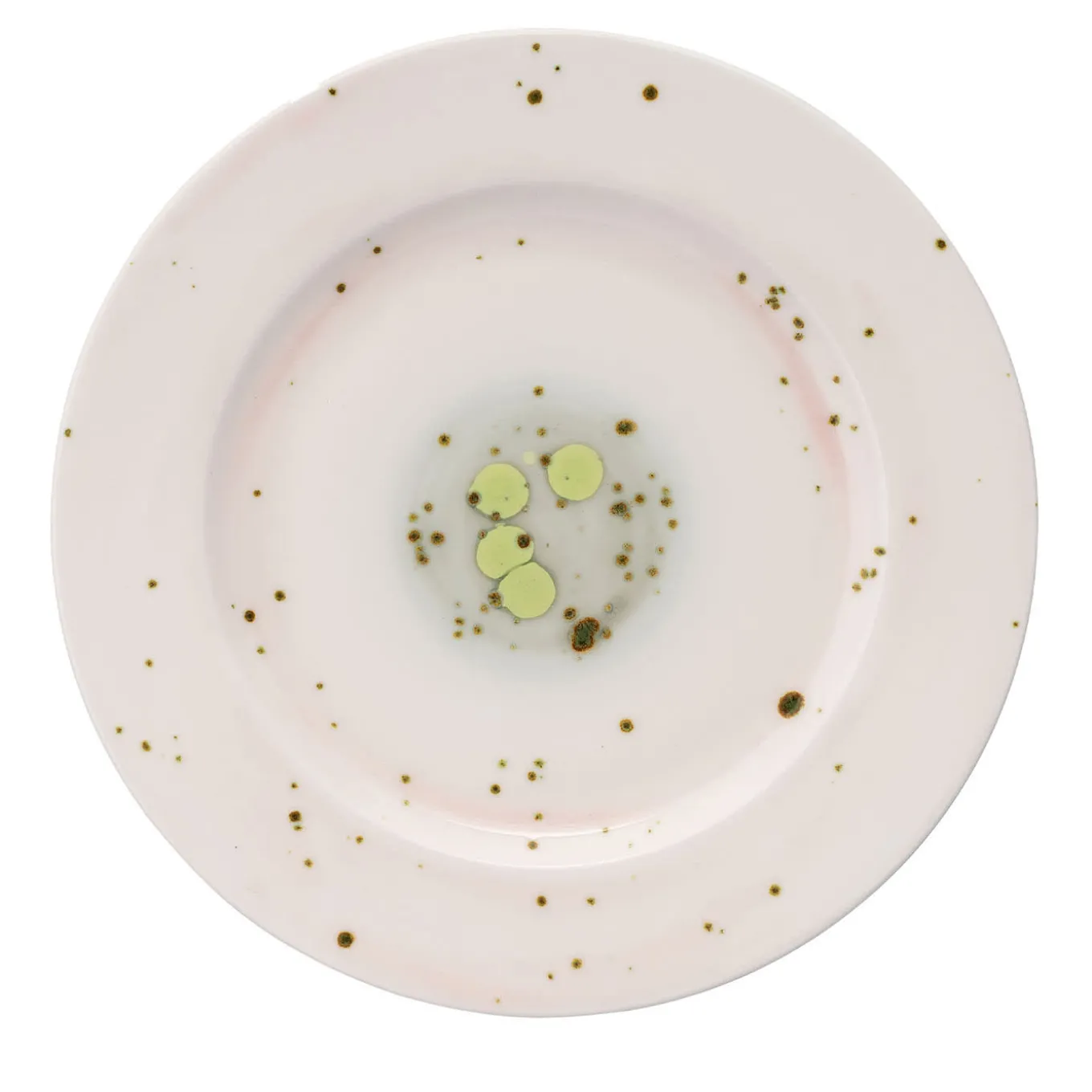 A refined set of two dinner rim plates in rich shades of green, adorned with dynamic pink spirals that unfurl from the center, drawing in bright green and black speckles—evoking the vibrant essence of the countryside at harvest time. This exquisite design is also available in an alternative version, featuring a delicate pink enamel finish, a soft light green center, and elegant green accents for a sophisticated seasonal touch. Contact the Concierge for additional information.