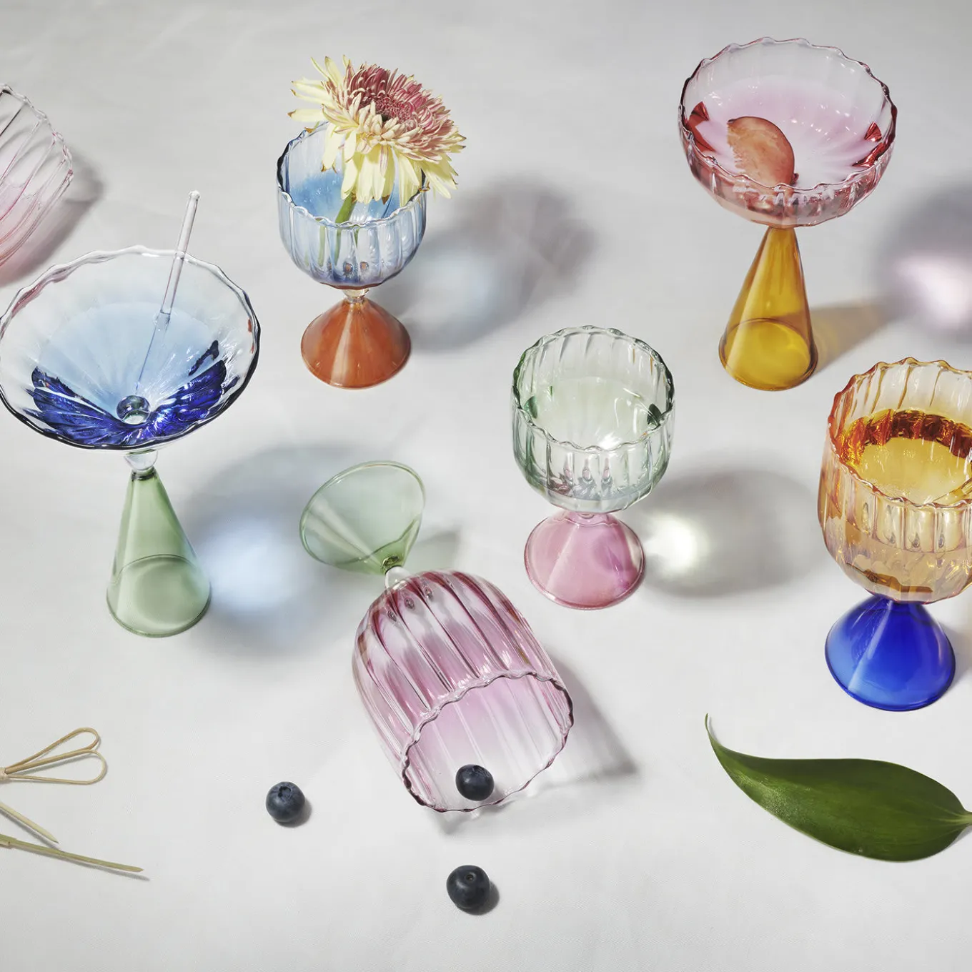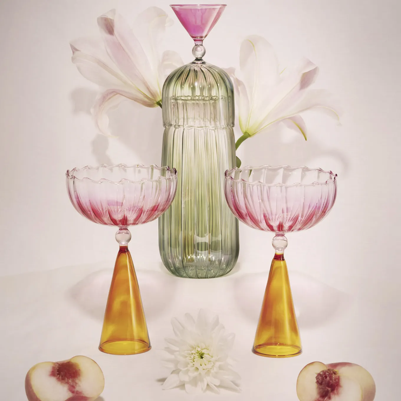 Raise these stunning wine glasses and clink them freely, knowing they are crafted of hand-blown borosilicate glass and will not shatter or crack. Distinguished by its delicate design and elegant Murano glass allure, these glasses showcase elegant amber-tinted conical stems with pink bowls that resemble rose petals. A truly unique combination of functionality and fine artisanship, these glasses may be combined with other elements from the Calypso Collection for a cohesive look.