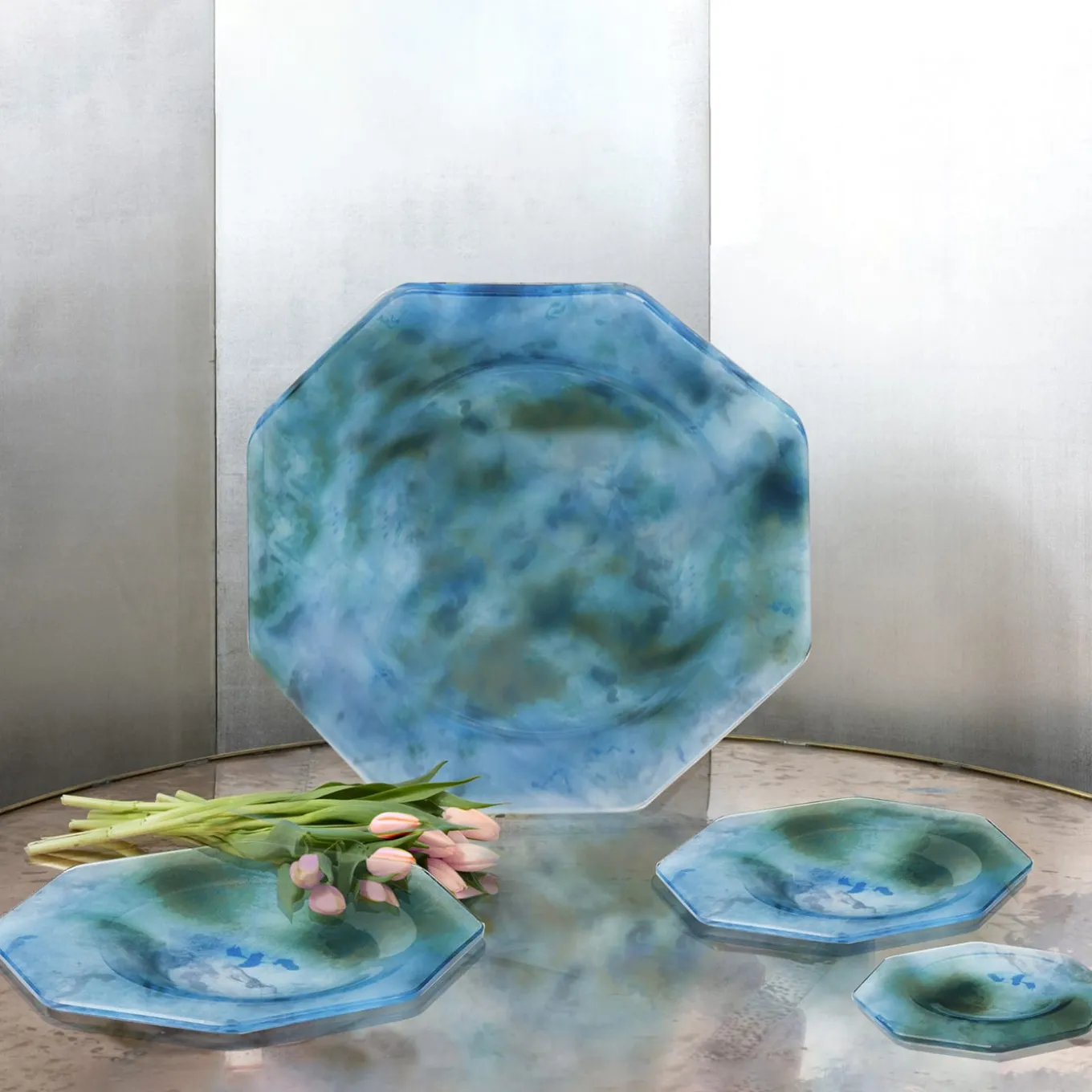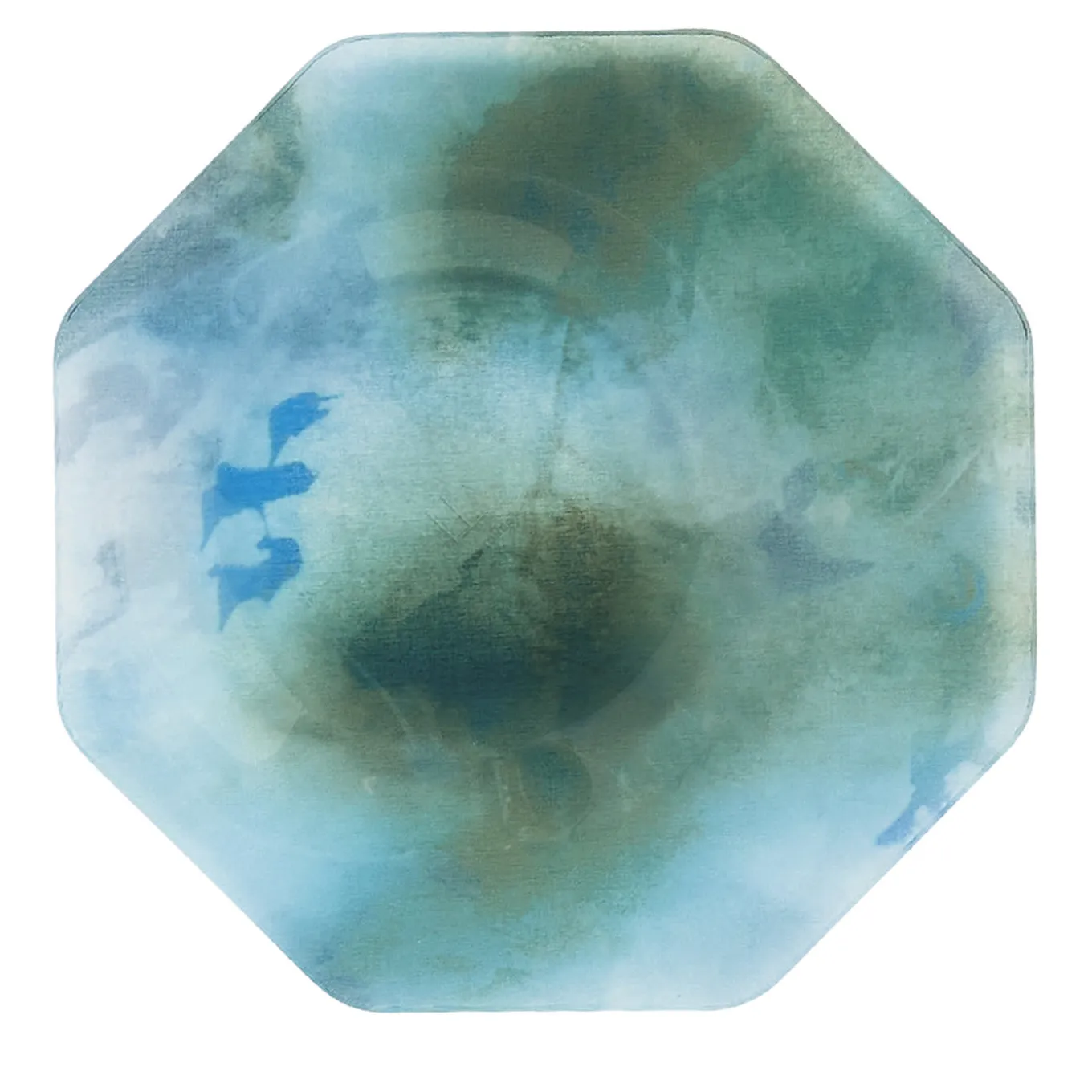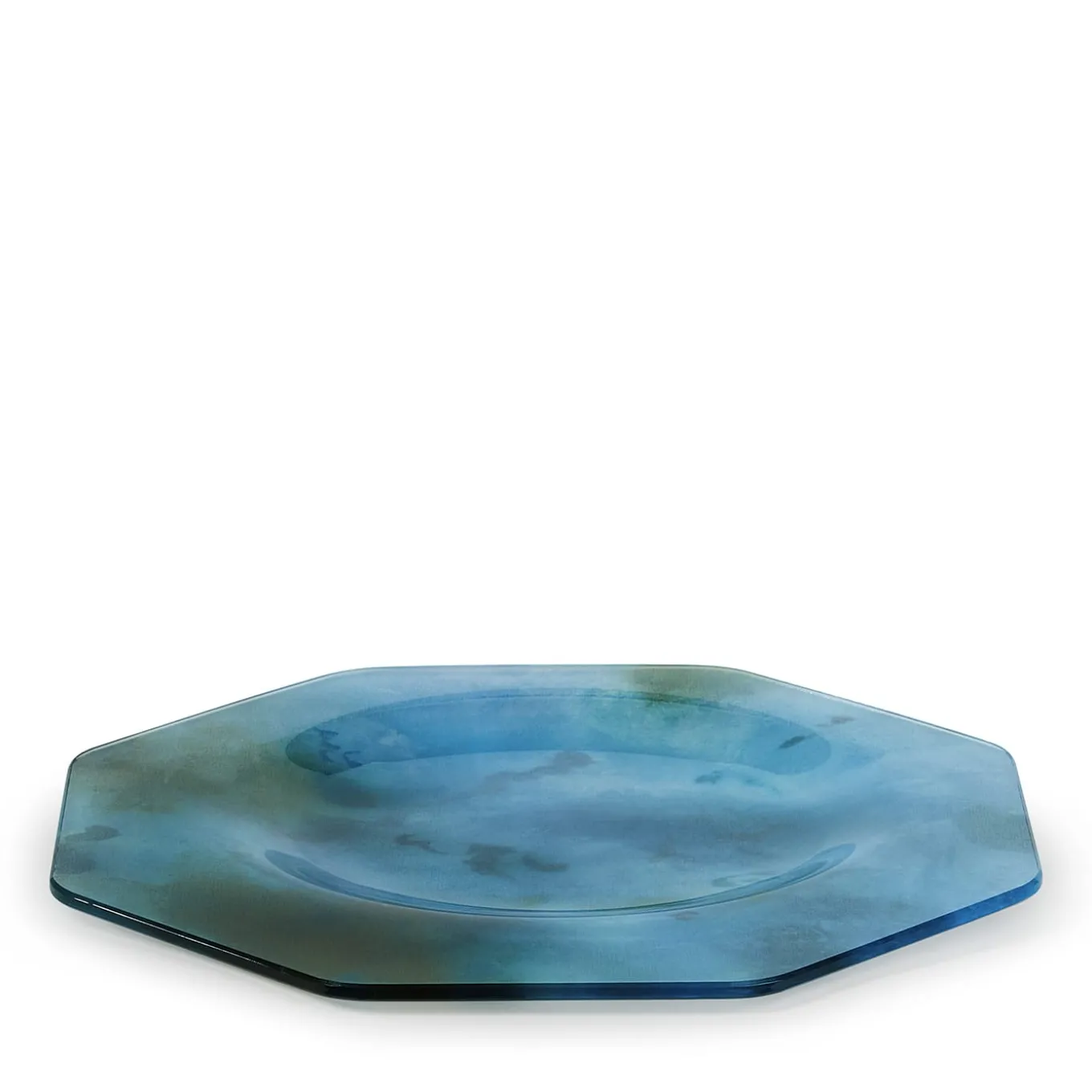 The perfect plate shape to be held with one hand while standing up and having a chat. The other hand holds a glass, a fork, and finger food. The octagonal shape is asymmetrical with a larger brim for a secure grip. The hollow base is off-center for perfect balance. The crystal-clear material used, methacrylate, is fused together with printed polyester organza, thermo-formed, and finished by hand. Food-certified, impact resistant, dishwasher safe, stackable, handy, and of great impact.