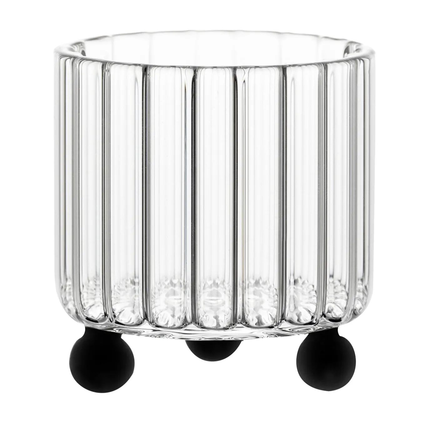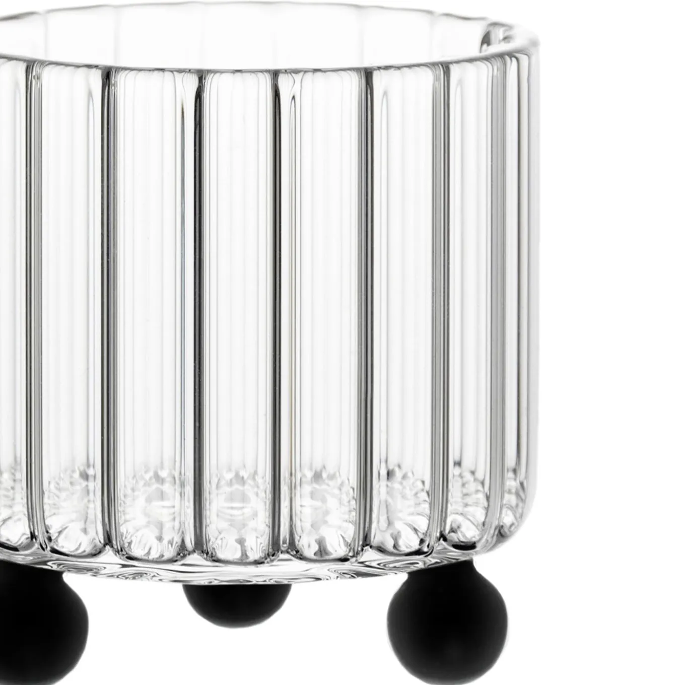 A lowball glass featuring an unconventional ribbed design inspired by postmodern architecture. The transparent glass body is elevated by three distinct black spheres, creating a playful sculptural effect. This design enables a subtle tilting motion, enhancing the sensory experience of enjoying spirits and cocktails.