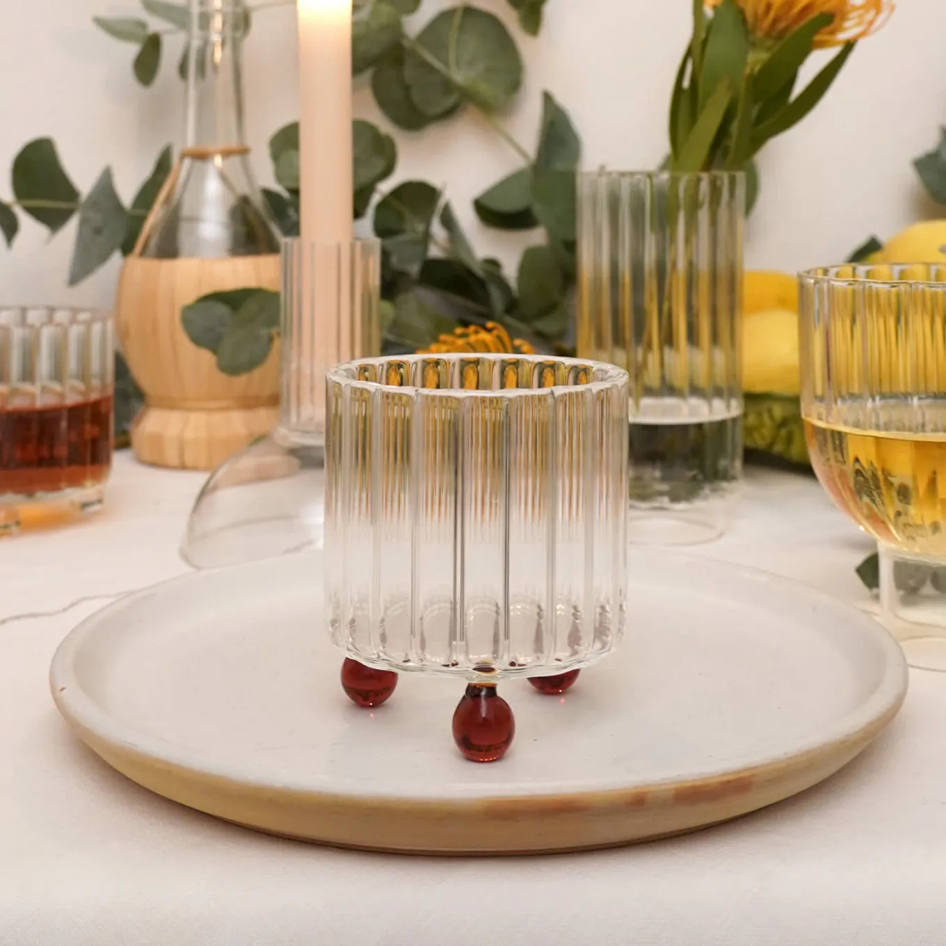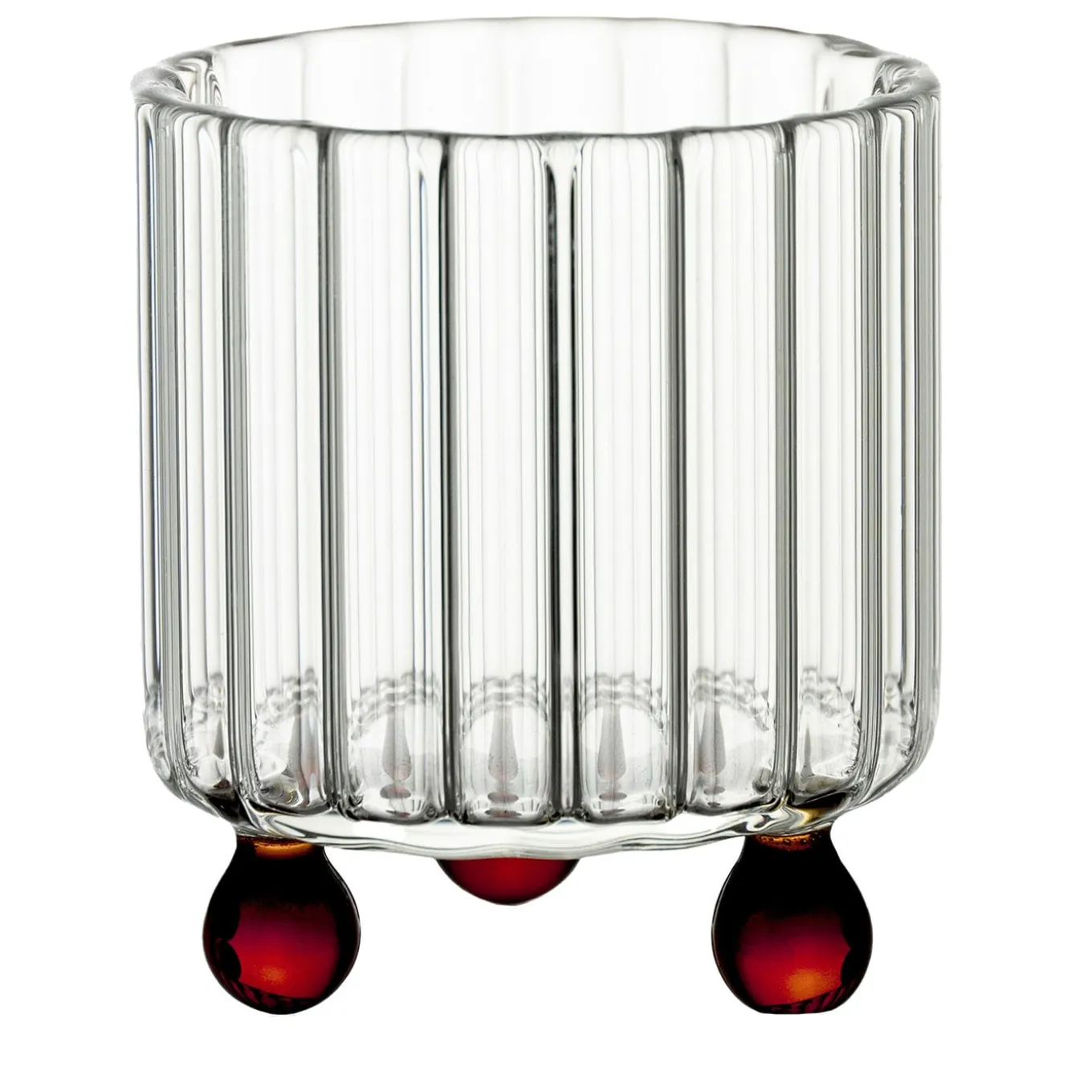 A lowball glass of an atypical shape, inspired by Postmodern architecture. Each piece is handmade in Italy by Master glassblowers, using high-quality borosilicate glass. The ribbed glass body rests on top of three red amber spheres, playfully elevating any drink. The sculptural design allows for a tilting motion, that encourages appreciating beverages and spirits.