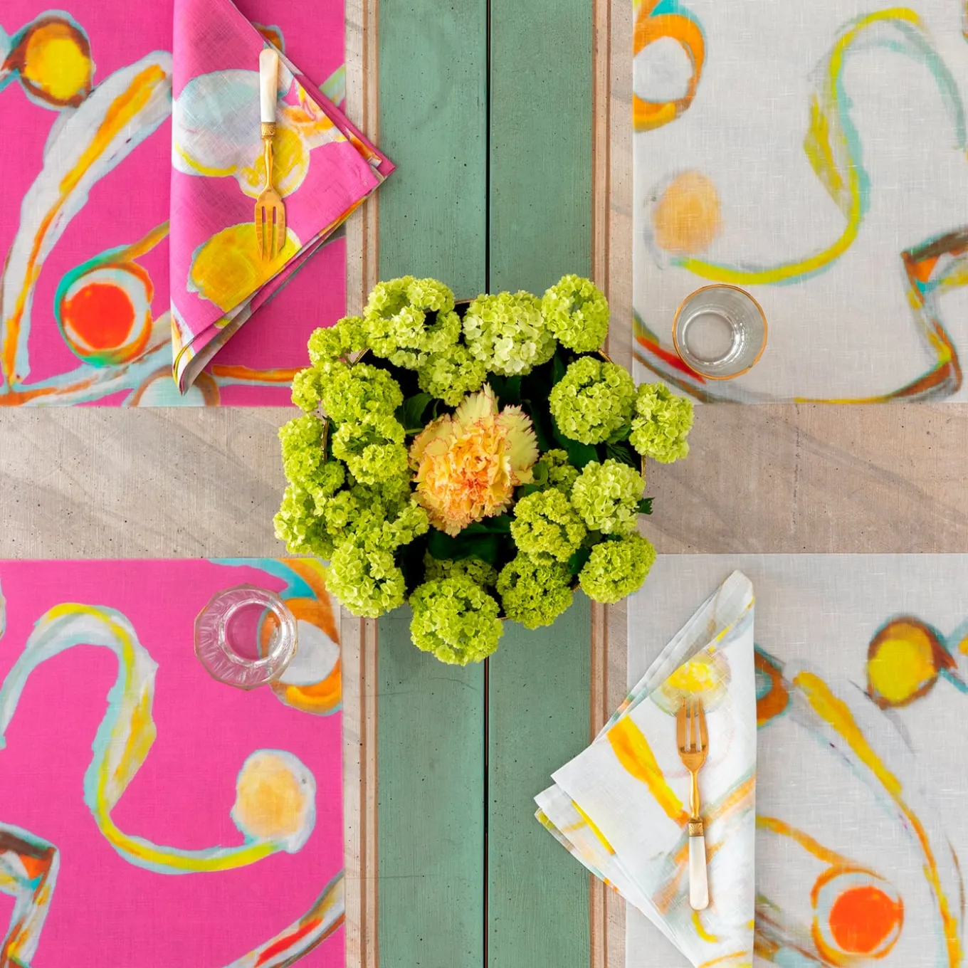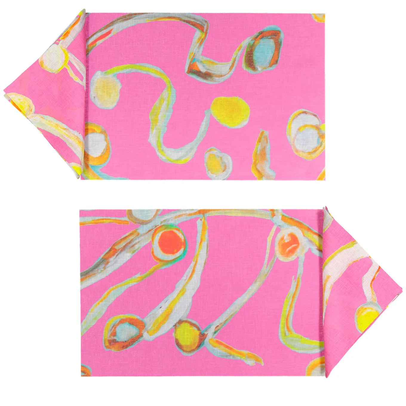 This original Luisa Longo hand-painted artwork has been digitally printed on linen, each piece is cut from a very large motif so all the mats will be different from each other, forming a unique table setting. The fabric has been embedded in an exclusive polyurethane solution with the softest peach skin feel. The placemats have an extraordinary resistance to heat, abrasions, and stains, light and totally flexible, can be washed just with a drop of water and soap.