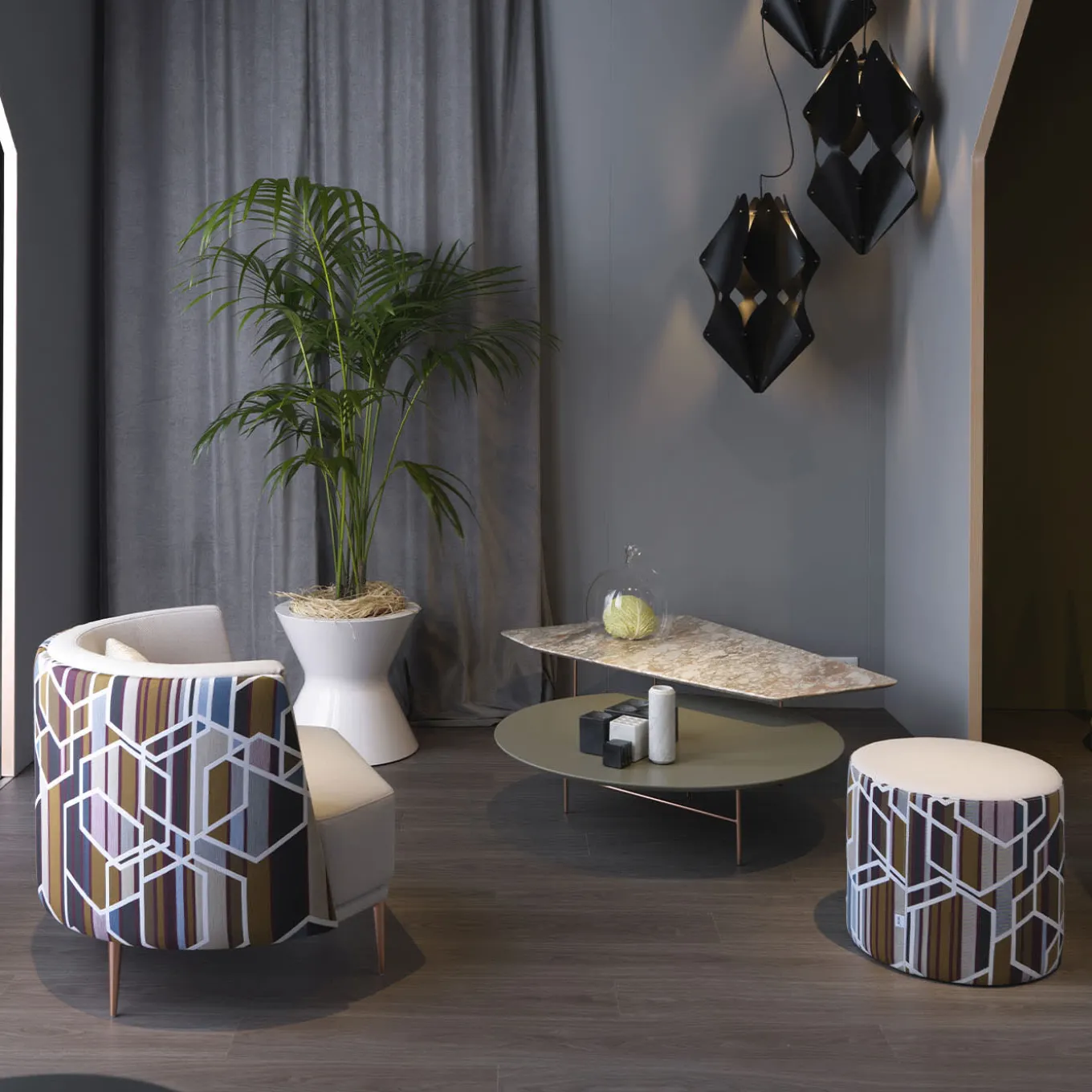 The Lovers coffee table exudes modern elegance with its unique design. Featuring a polygonal top in Rosa Norvegia marble and a round top in Fenix Verde Comodoro, it combines luxury with contemporary style. The painted metal structure in Copper adds a sleek, refined finish, making this table a standout piece in any living space. Dimensions table 1: 100x100x27.5h cm; dimensions table 2: 122x82x37.5h cm.