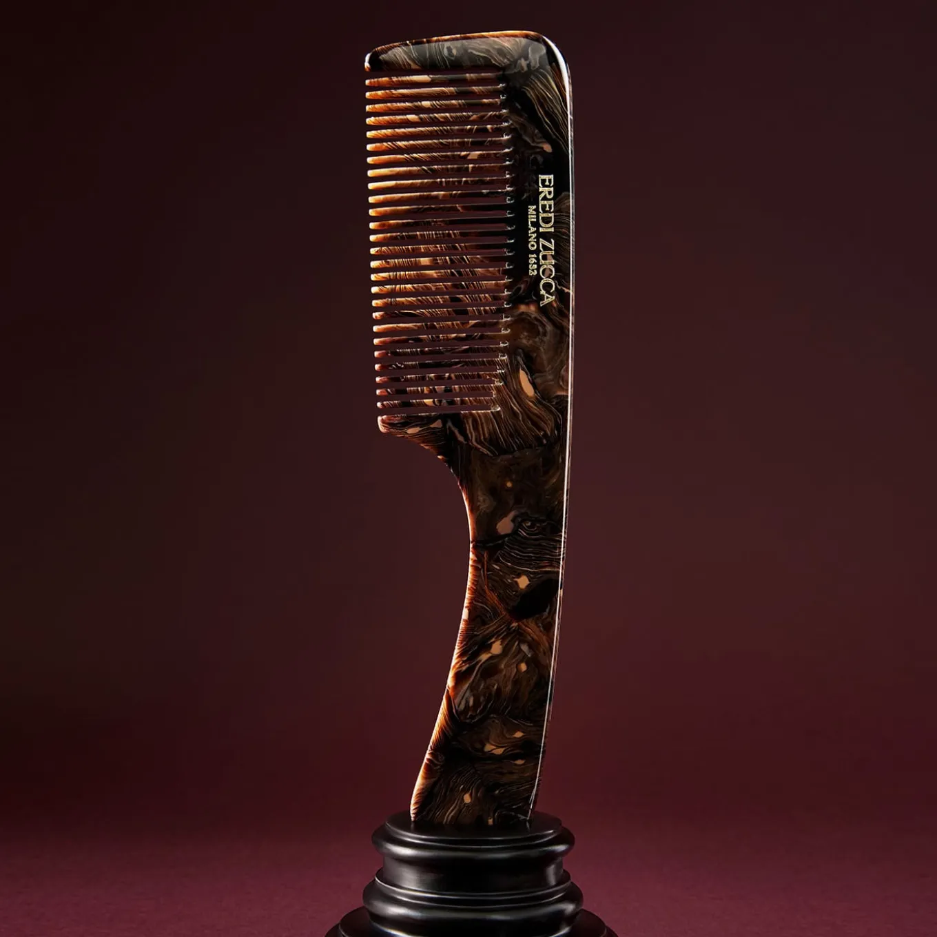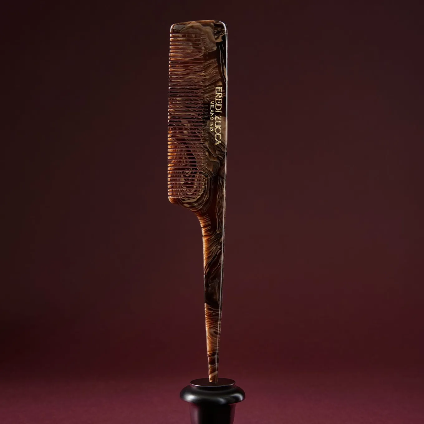 Elegant, practical and truly unique. Hand-crafted from Chocolate Carrara acetate, inspired by Eredi Zucca’s signature marble, this set of two fine-tooth comb is designed to untangle hairs delicately and with precision. Sturdy yet lightweight, one with an iconic pin-tail silhouette; one with a robust handle, are perfect for the everyday hair care. Naturally characterised by irregular patterns and color, they may present subtle differences that are not to be considered flaws.