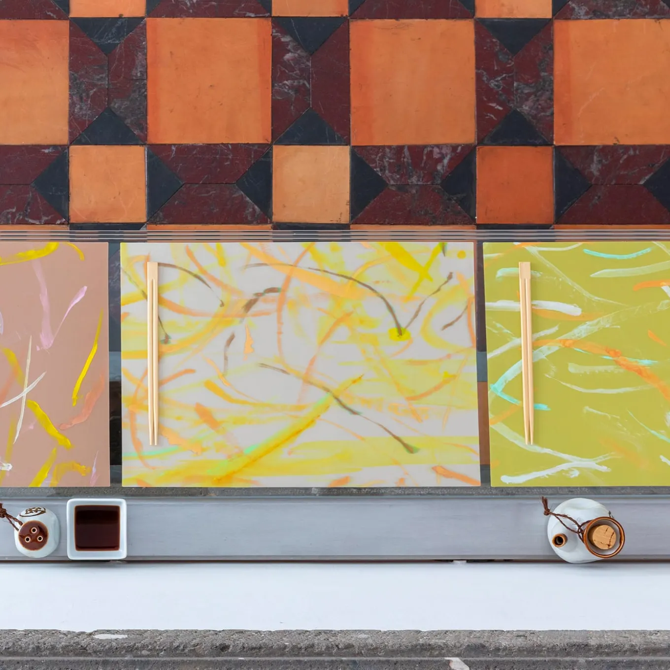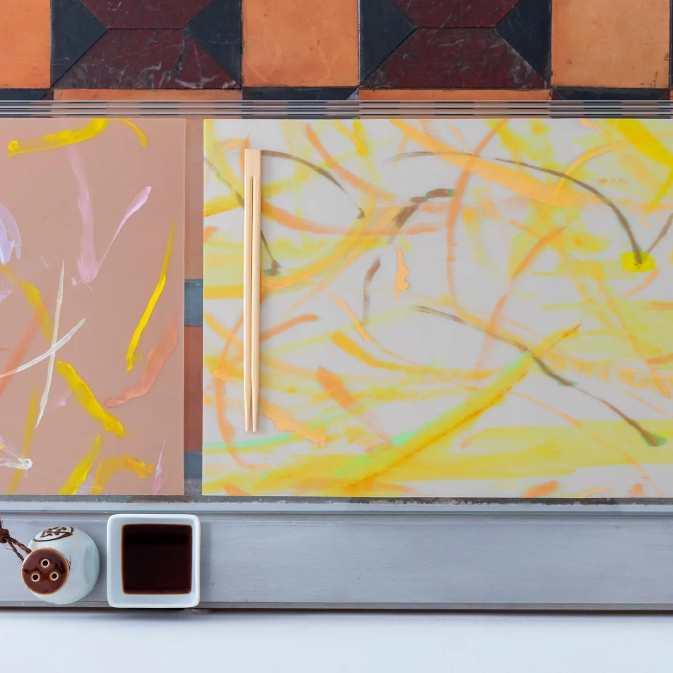 Luisa Longo’s precious original artwork, hand-painted on silk organza in mixed, metallic and iridescent colors, is embedded in a unique polyurethane solution with the softest peach-skin feel. The placemats have extraordinary resistance to heat, abrasion and stains, are lightweight and totally flexible, and can be washed simply with a drop of soap and water. The silk organza base gives an even softer feel to the touch, and the artist’s brush effects and color expertise are brought to great prominence. The napkins are made of 100% linen.