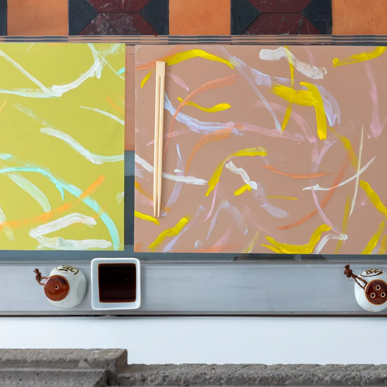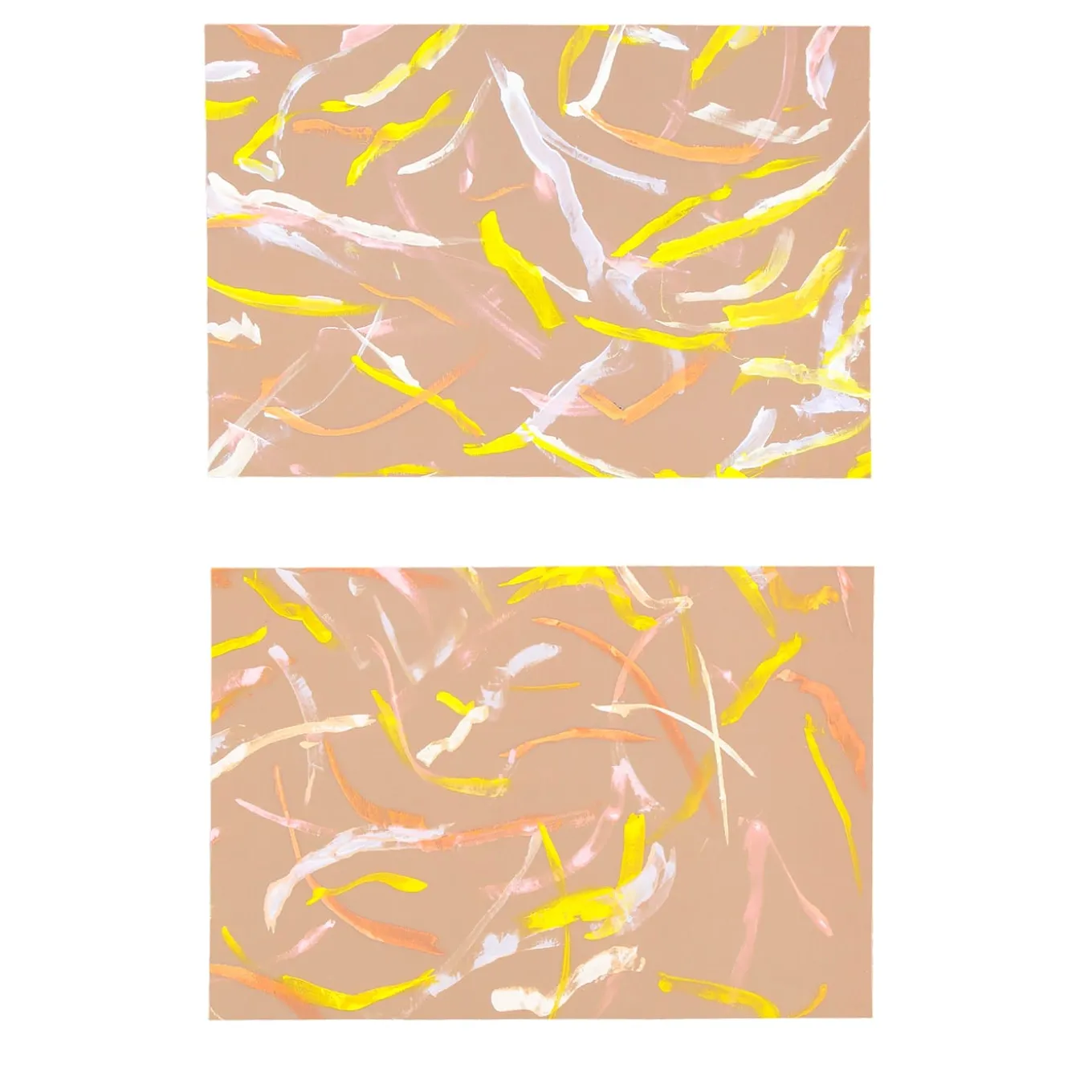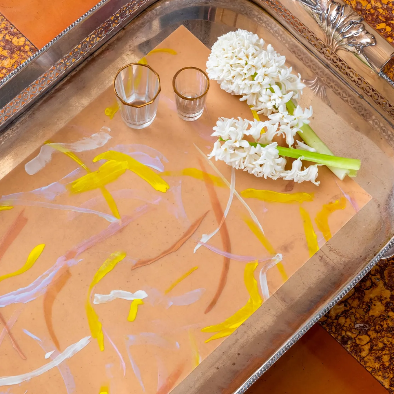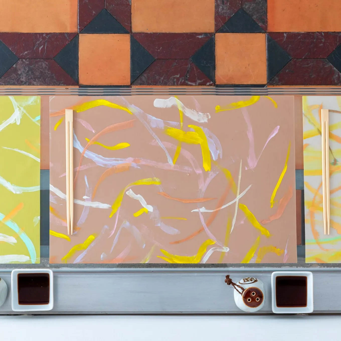 Original Luisa Longo precious hand-painted artwork on silk organza with mixed metallic and iridescent colors is embedded in an exclusive polyurethane solution with the softest peach-skin feel. The placemats have an extraordinary resistance to heat, abrasions, and stains, are light and totally flexible, can be washed just with a drop of water and soap. The silk organza base gives an even smoother feel and the artist’s paintbrush effects and color expertise are greatly emphasized.