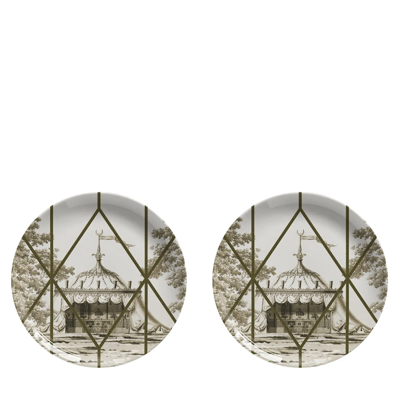 Part of the Topkapi collection, this set of two porcelain plates is adorned with sepia-toned decorations on a white background. The scene, viewed through a closed gate, features a tent nestled among trees—an homage to the outdoor elegance and mystery of 15th-century Ottoman Turkey. Rich in narrative detail, these pieces can be used individually or combined with others from the collection in different colors to create a refined and visually engaging table setting.