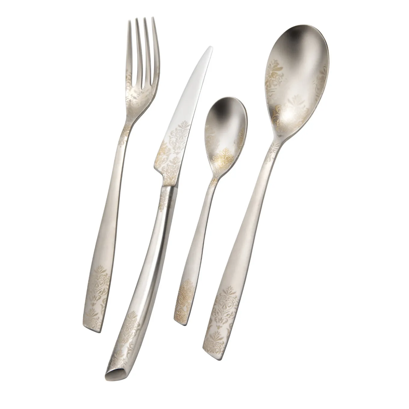 Featuring Casa Bugatti’s Devorè embellishment and a sandblasted finish, this set of twenty-four pieces includes six forks, knives, soup spoons and teaspoons. A unique set that pairs flawlessly with any dishes, the silverware is made in 18/10 stainless steel and comes with a wengè wood box. Also available for the US market in a thirty-piece set.