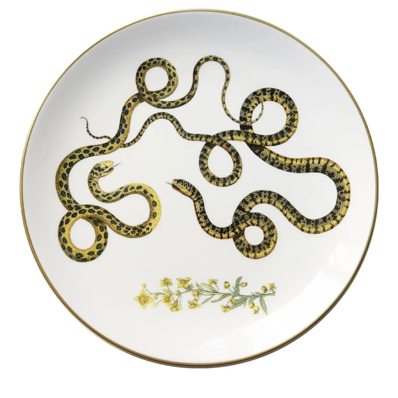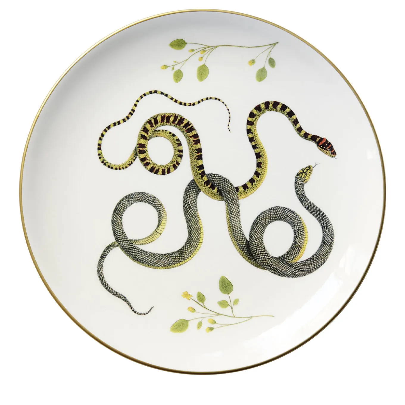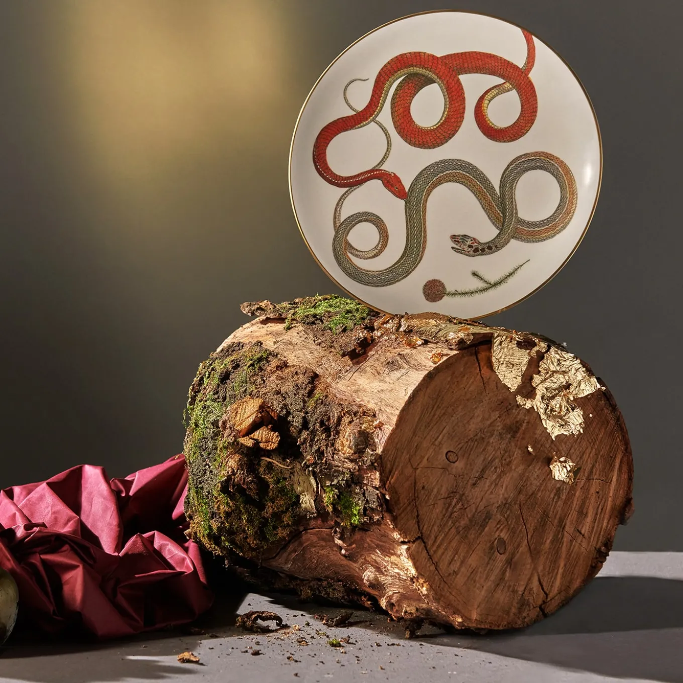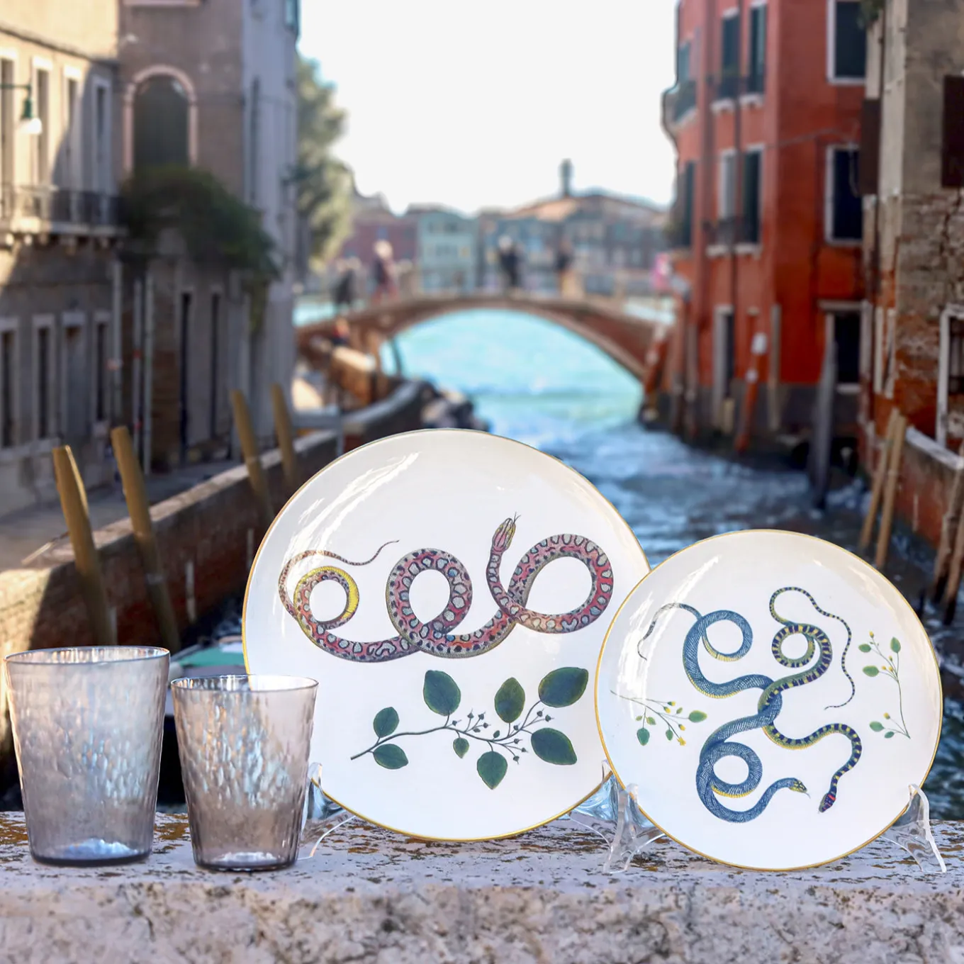 No words are required in front of the enchanting magic of snakes: their coils stand out on the white of a plate or wrap sinuously on a garnet red background. The gold on the edge, whether in the form of a thread or a band, emphasizes the intricate preciousness of this intriguing Collection. Whatever choice is made, this series will undoubtedly dominate the conversation for an entire evening. Allow yourself to be enchanted.