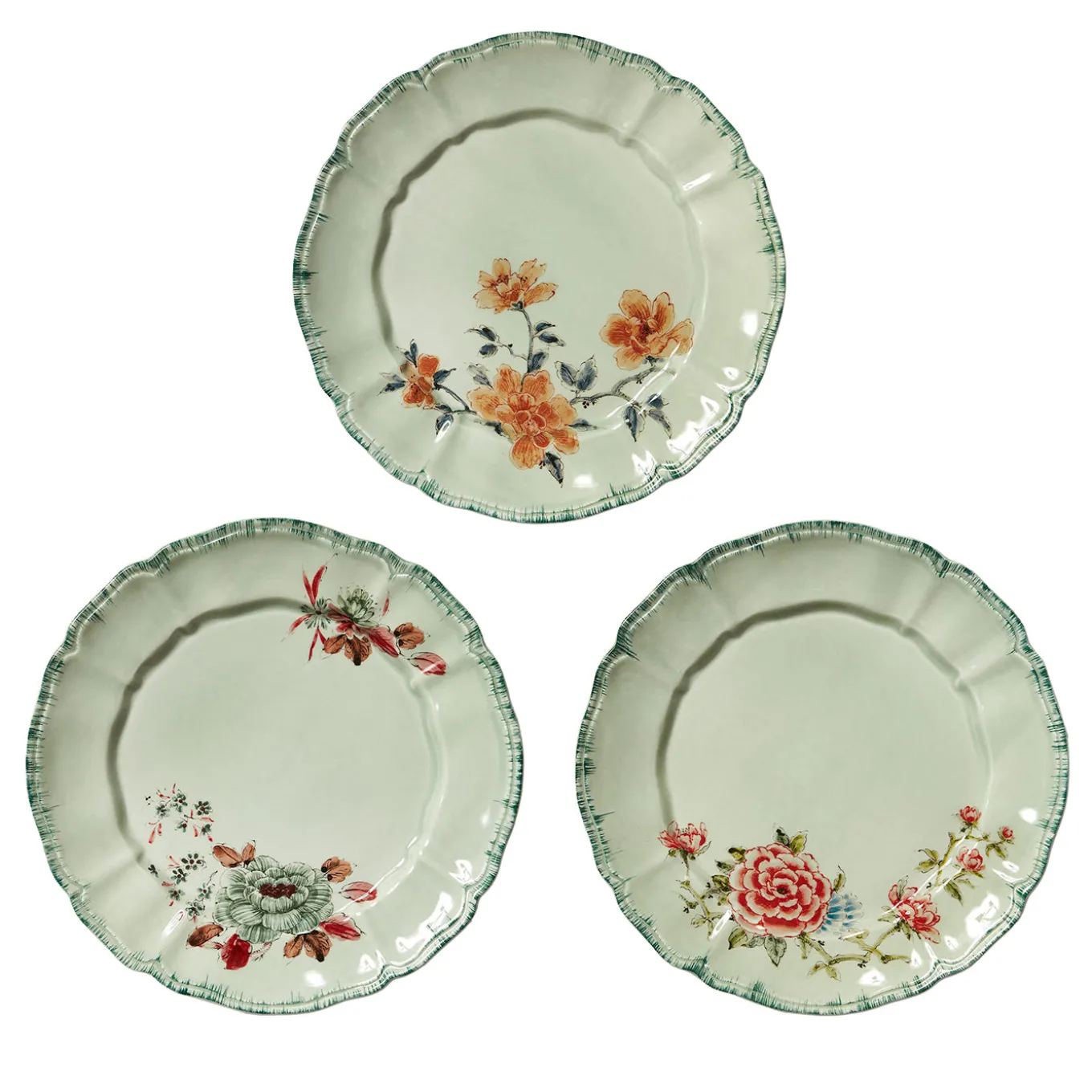 This collection, which was born within a capsule of ceramics and home textiles created in collaboration with Lisa Corti, combines the history and imagery of two worlds in a fresh and versatile palette. The shaped form emphasizes the romantic theme, while the fringed, hand-painted edge recalls traditional ikat textile prints.