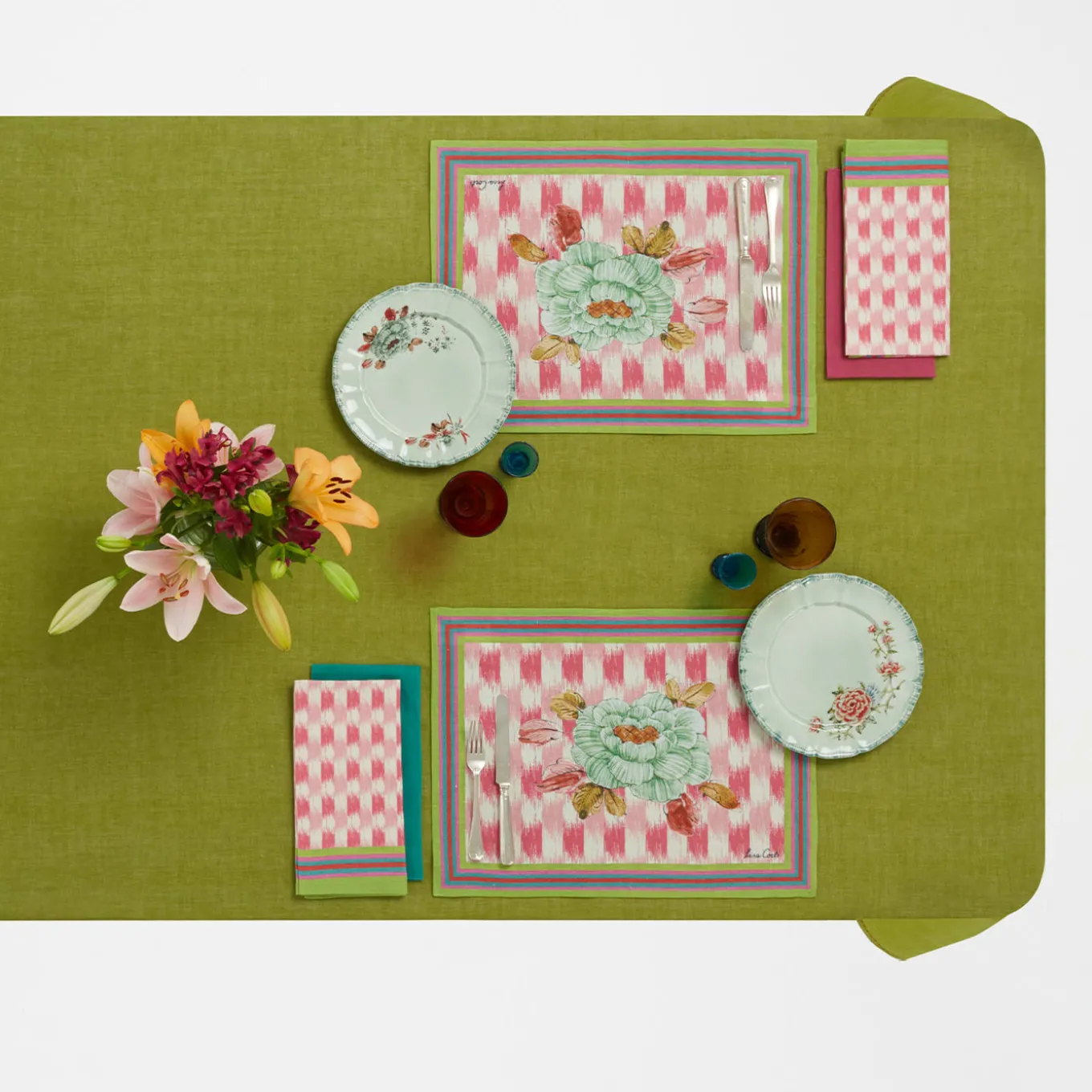 This collection, which was born within a capsule of ceramics and home textiles created in collaboration with Lisa Corti, combines the history and imagery of two worlds in a fresh and versatile palette. The shaped form emphasizes the romantic theme, while the fringed, hand-painted edge recalls traditional ikat textile prints.