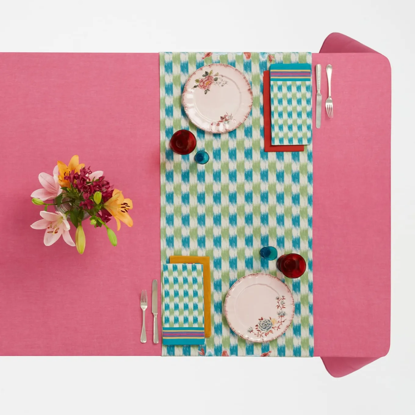 This collection, which was born within a capsule of ceramics and home textiles created in collaboration with Lisa Corti, combines the history and imagery of two worlds in a fresh and versatile palette. The shaped form emphasizes the romantic theme, while the fringed, hand-painted edge recalls traditional ikat textile prints.