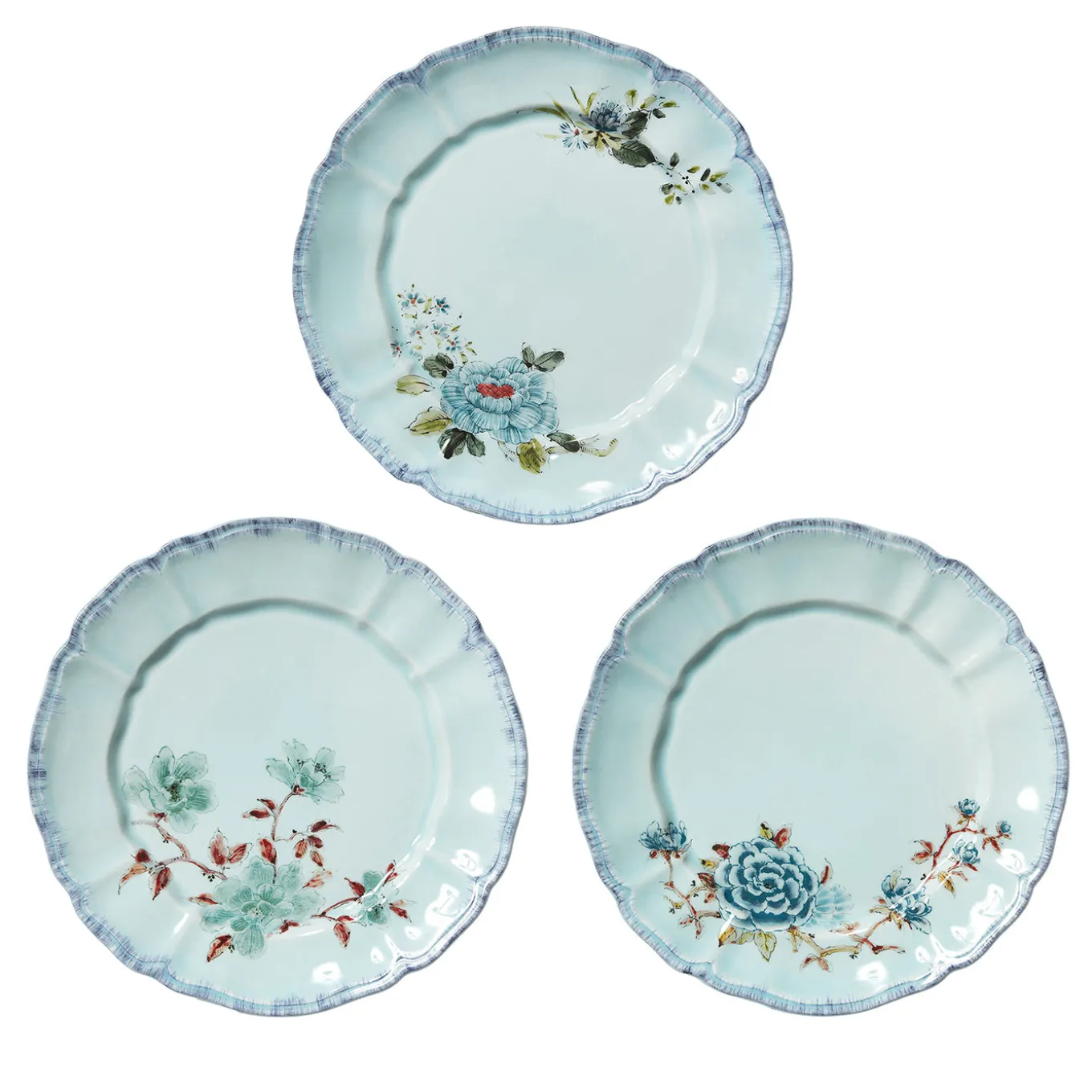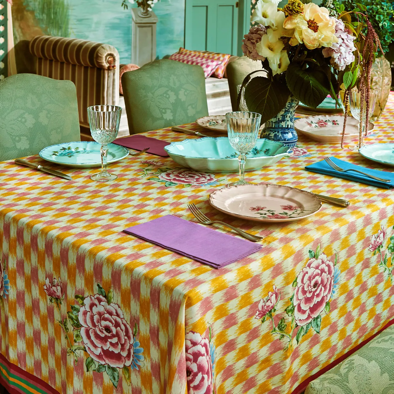 This collection, which was born within a capsule of ceramics and home textiles created in collaboration with Lisa Corti, combines the history and imagery of two worlds in a fresh and versatile palette. The shaped form emphasizes the romantic theme, while the fringed, hand-painted edge recalls traditional ikat textile prints.