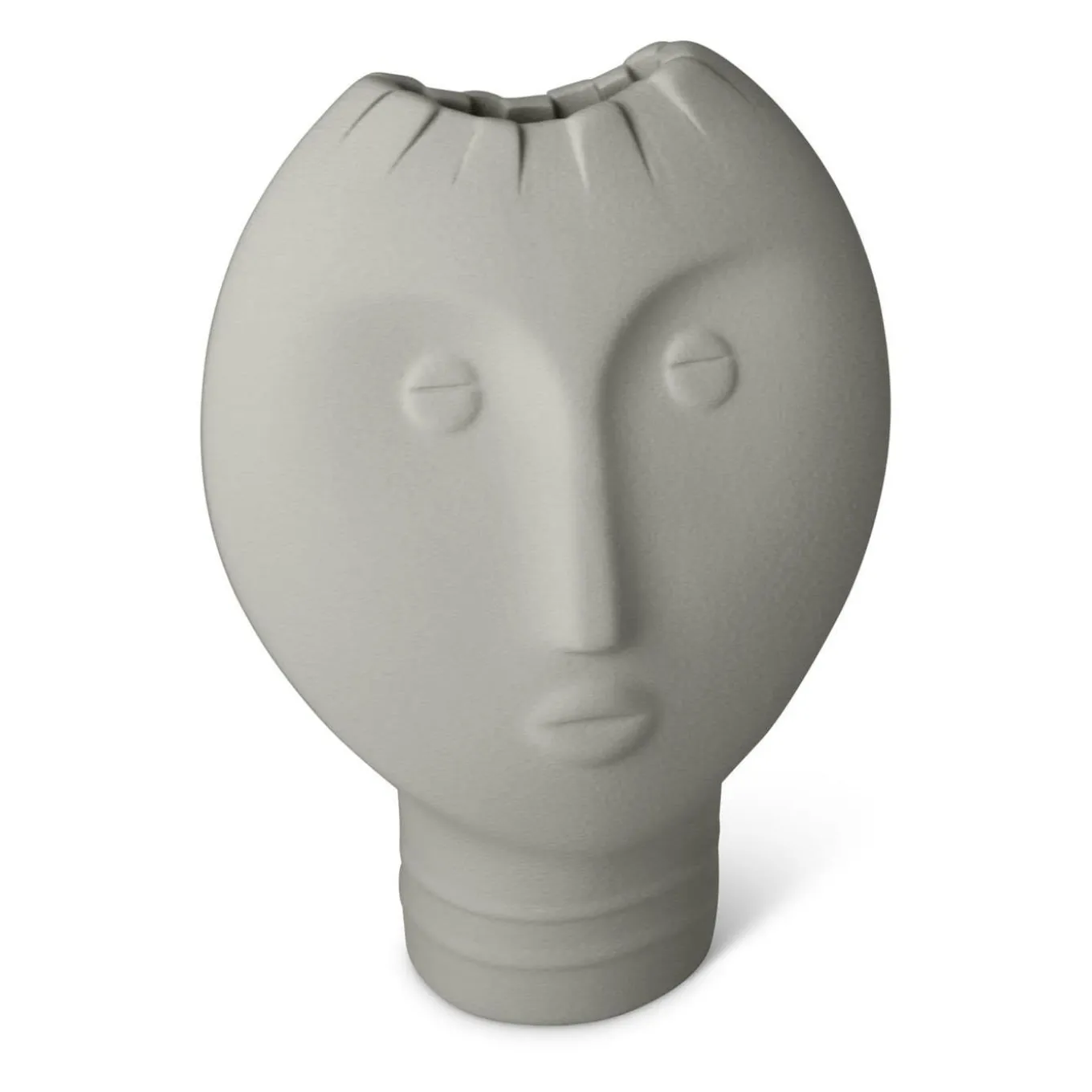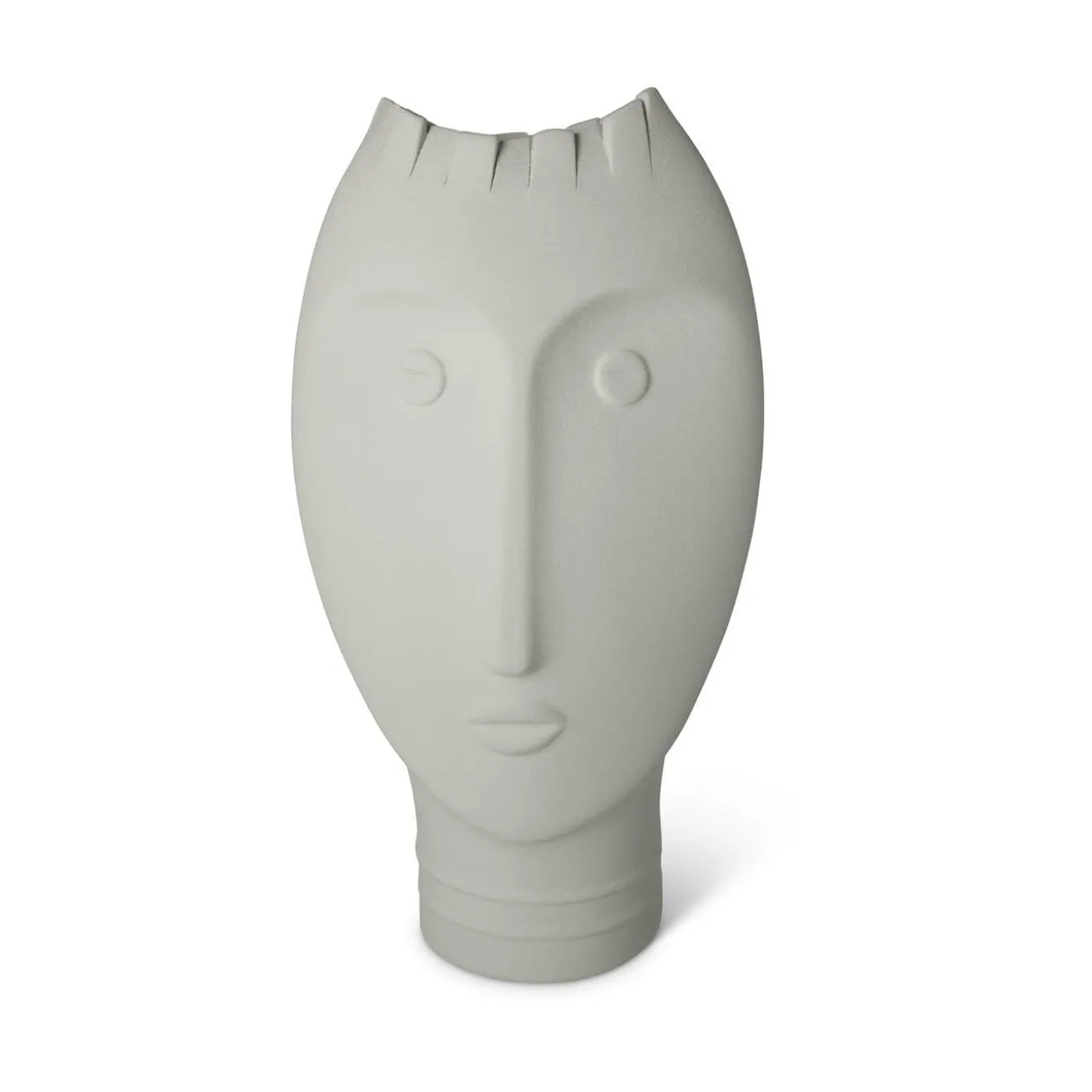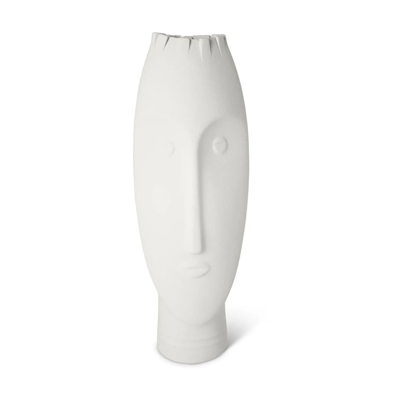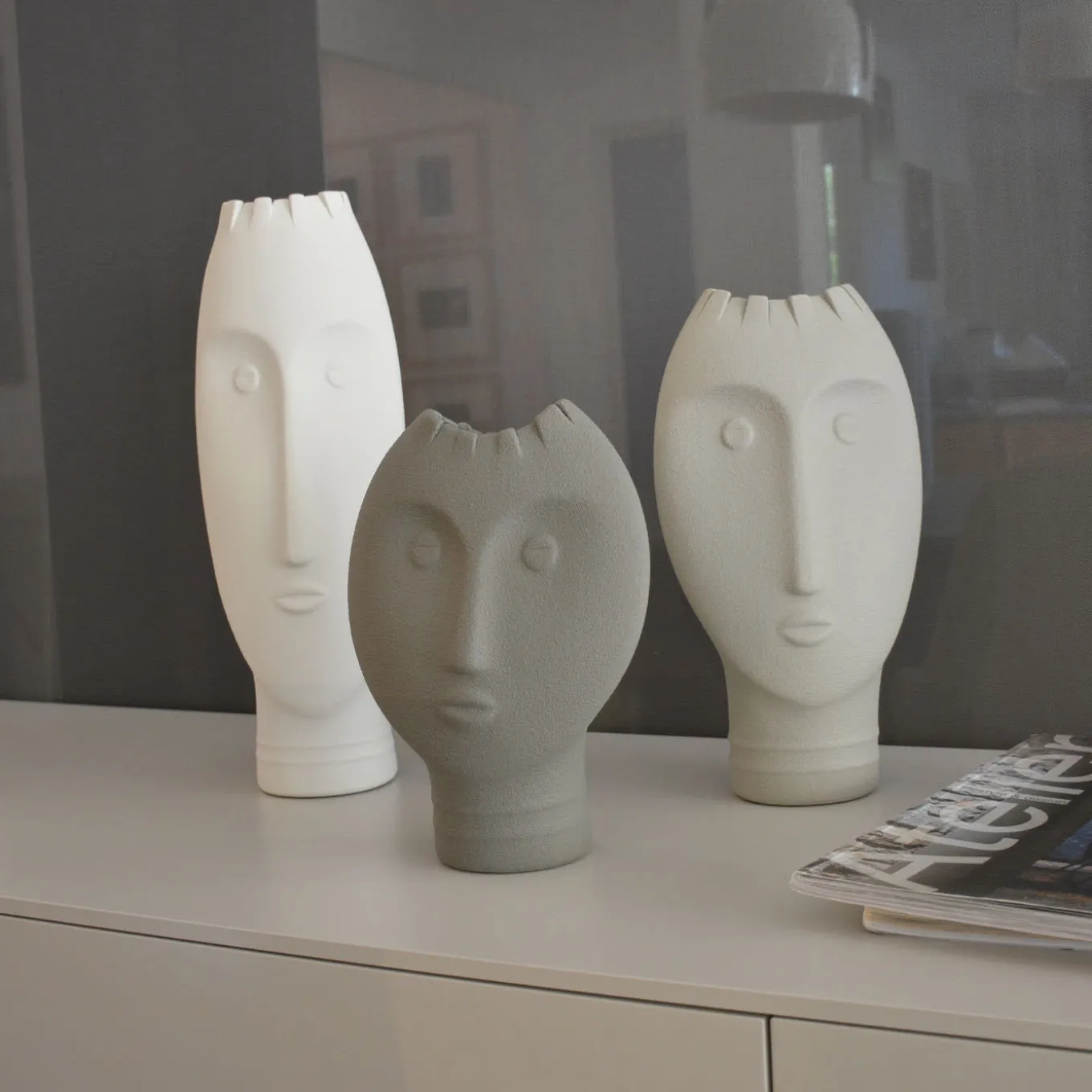 Long faces and intense gazes, these vases have an ancestral charm, reminding the huge Moai faces of the Easter Island. These pieces (Dimensions: W14xD11xH41 cm, W17xD11xH33 cm, W18xD11xH26 cm) express the artistic value of Italian craftsmanship. The manual technique with which they are made involves cutting the clay in a way that is always original and irregular, delicately moving the fringe motif. Design by Giuseppe Bucco.