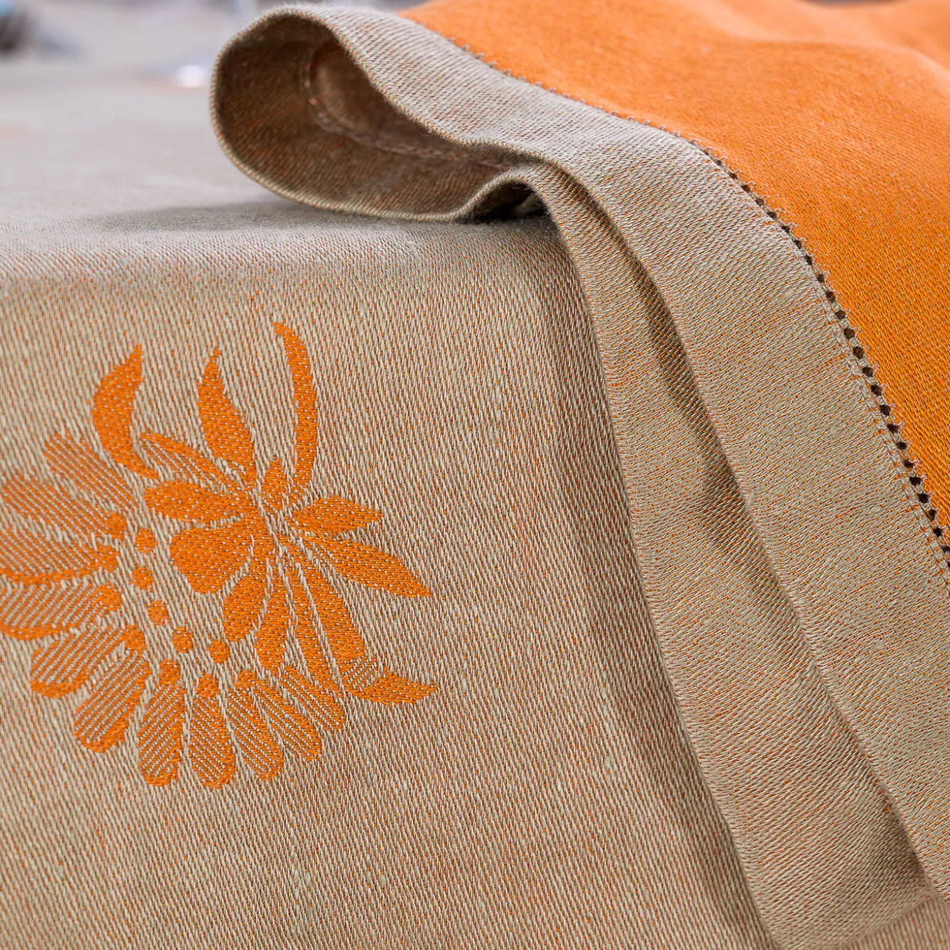 Waving tradition reinterpreted in an exquisitely modern lens defines this precious two-sided jacquard napkin in pure Fiandra linen. A refined hemstitched detailing accents the contrast between its bold soft-brown borders and central design offered in a vibrant amber tone. Please consult the Concierge for color variants and detailed care instructions.