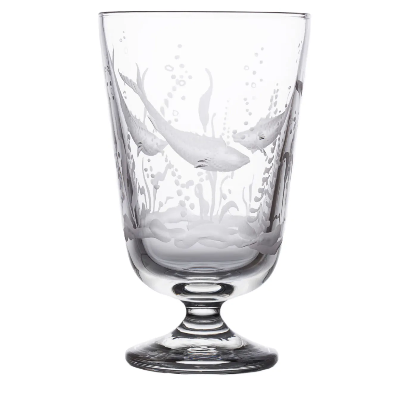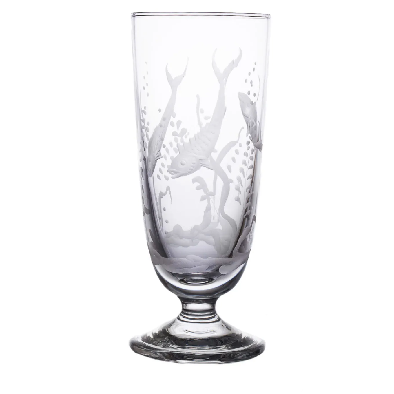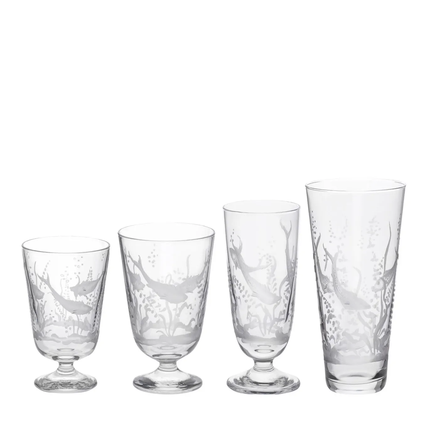 A set of 4 different glasses depicting an underwater scene, flawlessly engraved by the skilled artisans of Moleria Locchi in Florence. Note the different yet millimetric depths in the handmade etchings, in particular the detail of the fish scales, that make up this classic design. Water glass: L 7,5 X H 12 X 7,5 cm; wine glass: L 6,5 X H 11,5 X 6,5 cm; champagne glass: L 5,8 X H 14 X 5,8 cm; tall glass: L 7,5 X 16 X 7,5 cm.