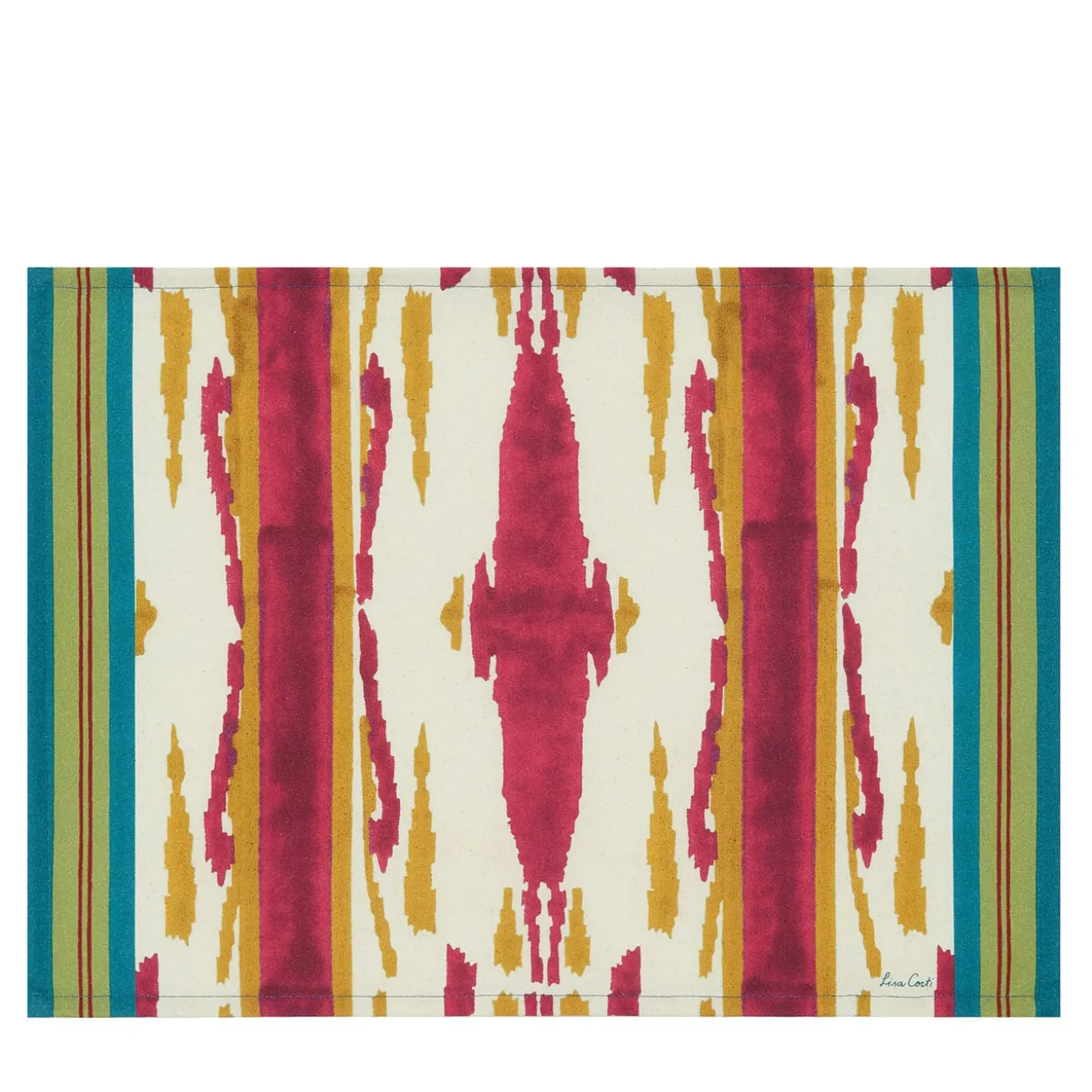 Lisa Corti’s 100% cotton placemats add timeless charm to any table, indoors or outdoors. Handcrafted in India with traditional blockprint techniques, each placemat boasts unique imperfections that enhance its character. The Aubergine-gold design features alternating red, gold, and white stripes, framed by a stunning mirrored geometric motif in a gouache-like effect, making each piece a distinctive work of art.