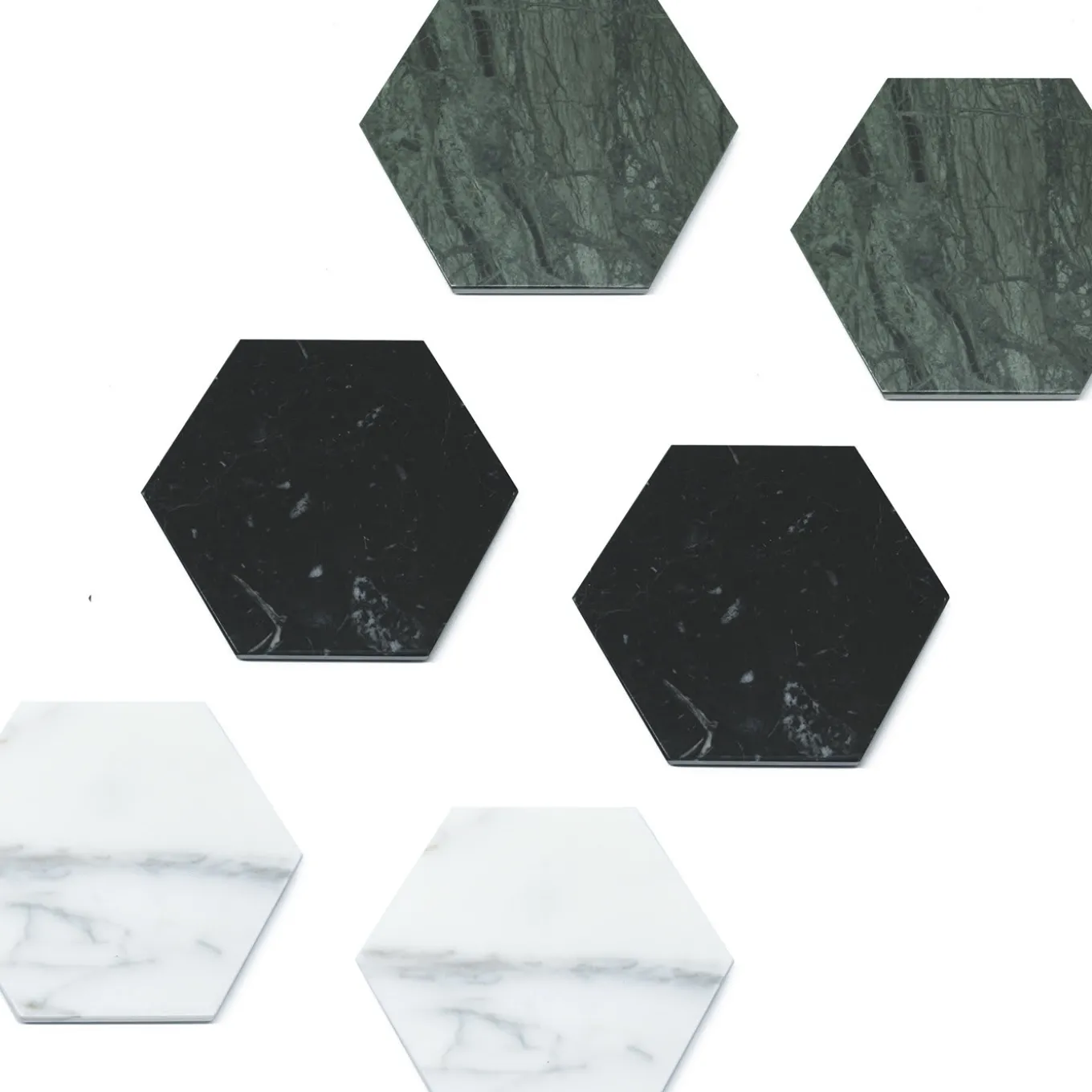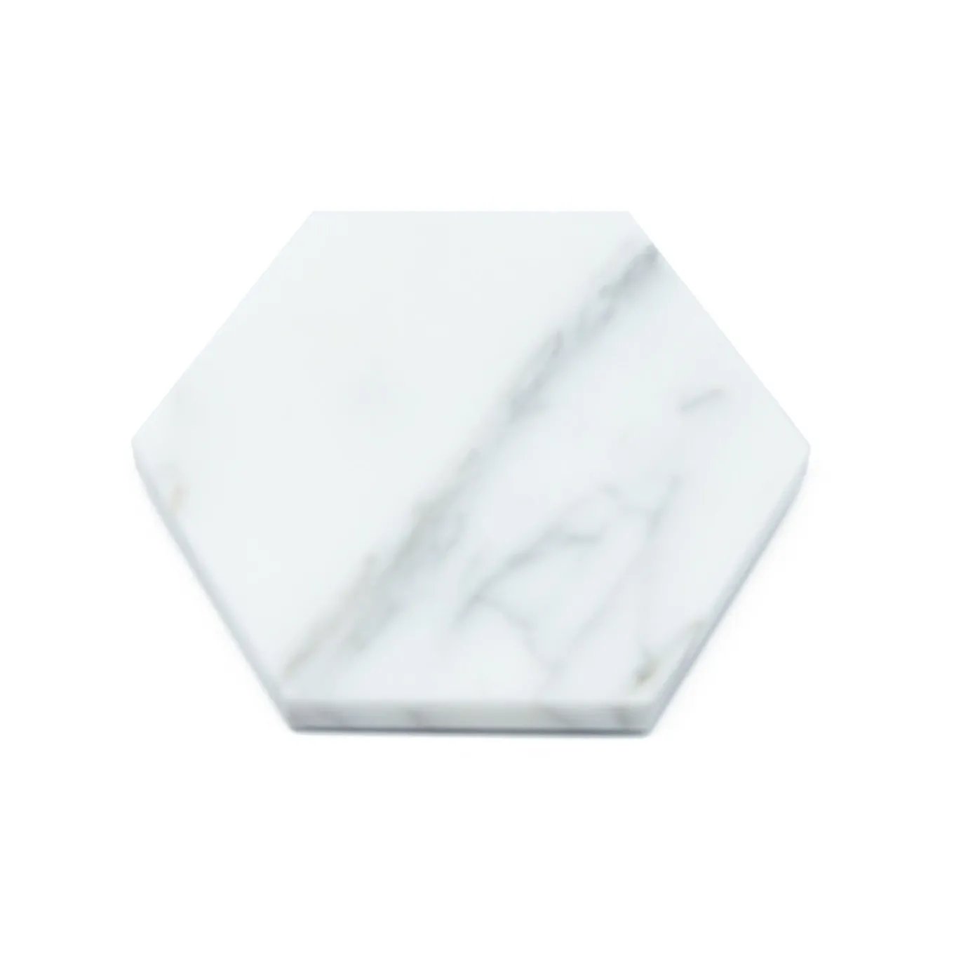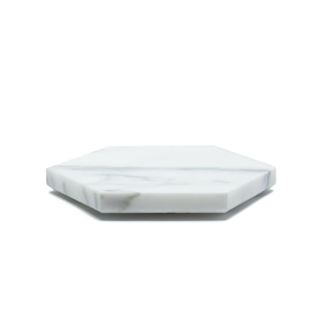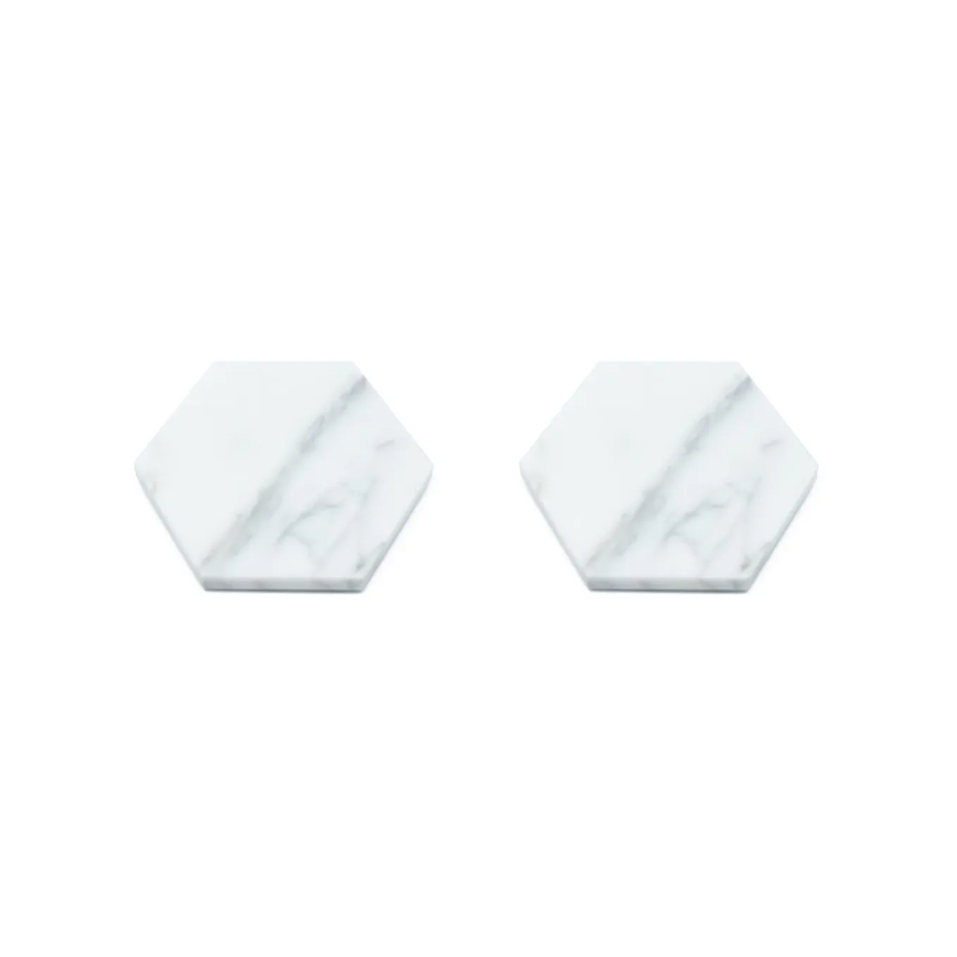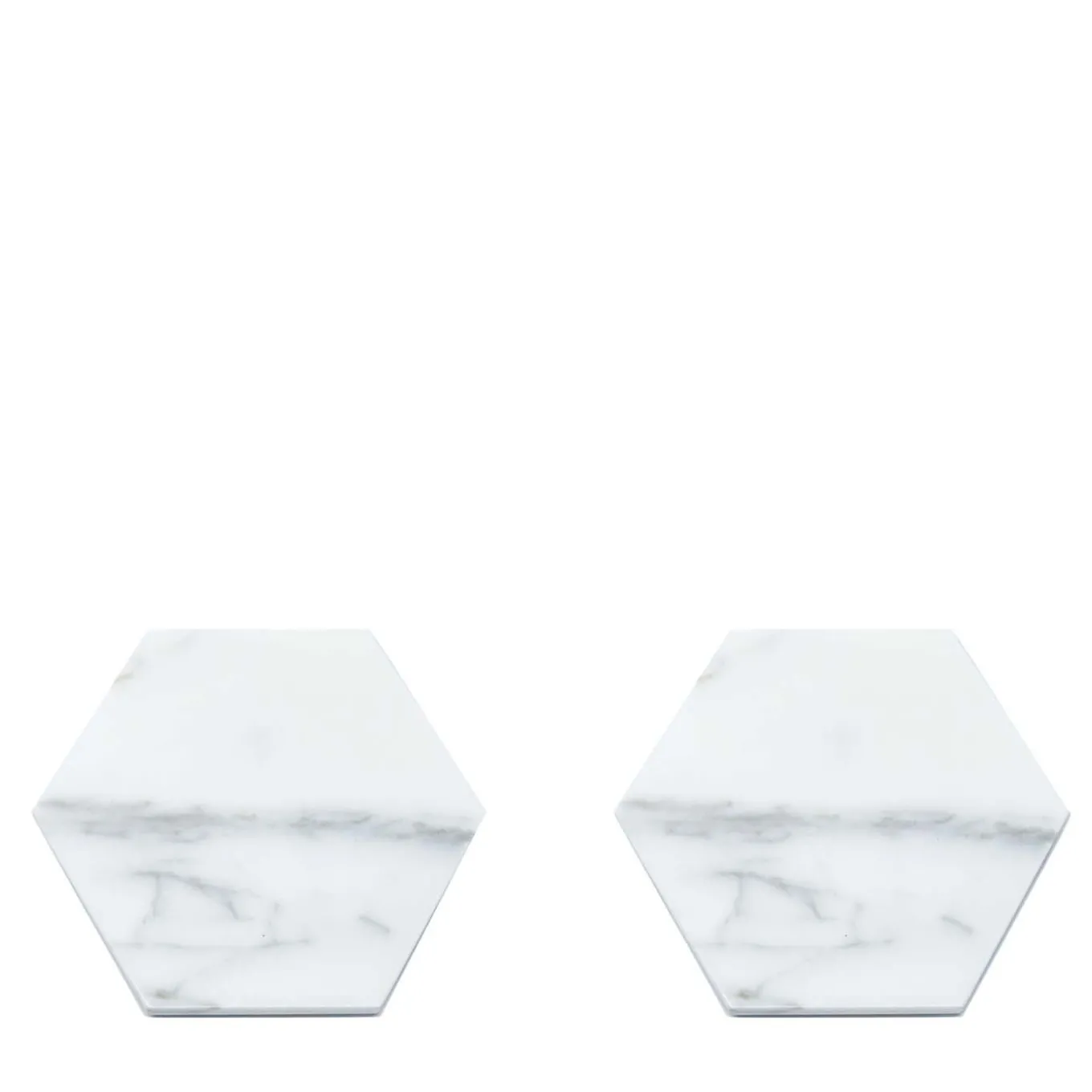 This set of hexagonal coasters in white marble exudes effortless sophistication. Featuring a bottom layer of cork as grip, the coasters showcase the characteristic, natural veining of the precious stone. The distinct geometric flair inspiring this set will be a perfect match for refined contemporary decors.