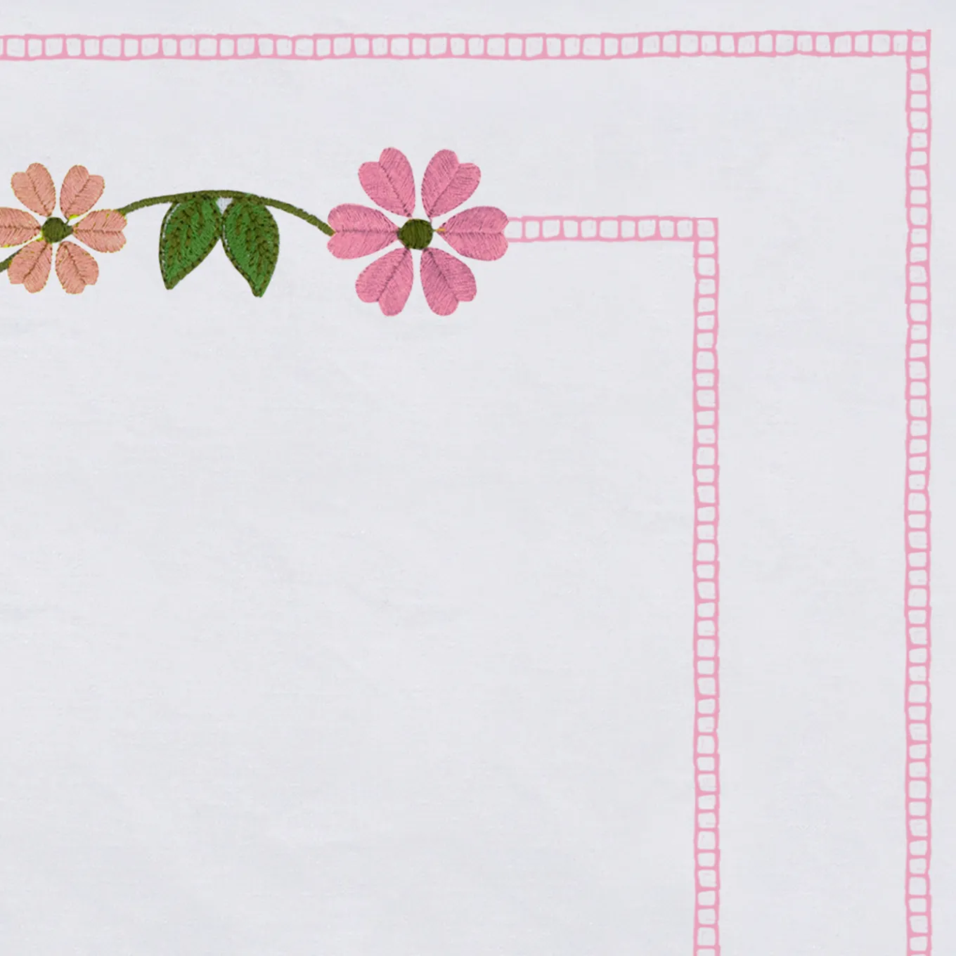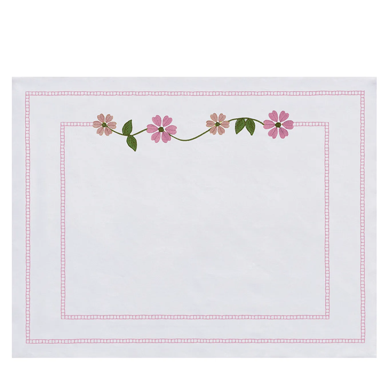 Set of 4 placemats featuring delicate pink margherita floral embroidery inspired by wildflowers from southern Italy. Crafted on a white linen base with cotton makò thread, each piece showcases detailed stitching framed by a double-lined border. The floral motif symbolizes gratitude and celebration, adding a refined and festive touch to the table setting. Designed with attention to detail, these elegant placemats complement sophisticated dining arrangements.