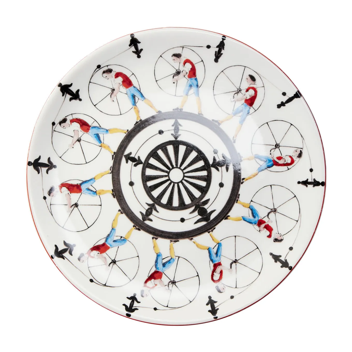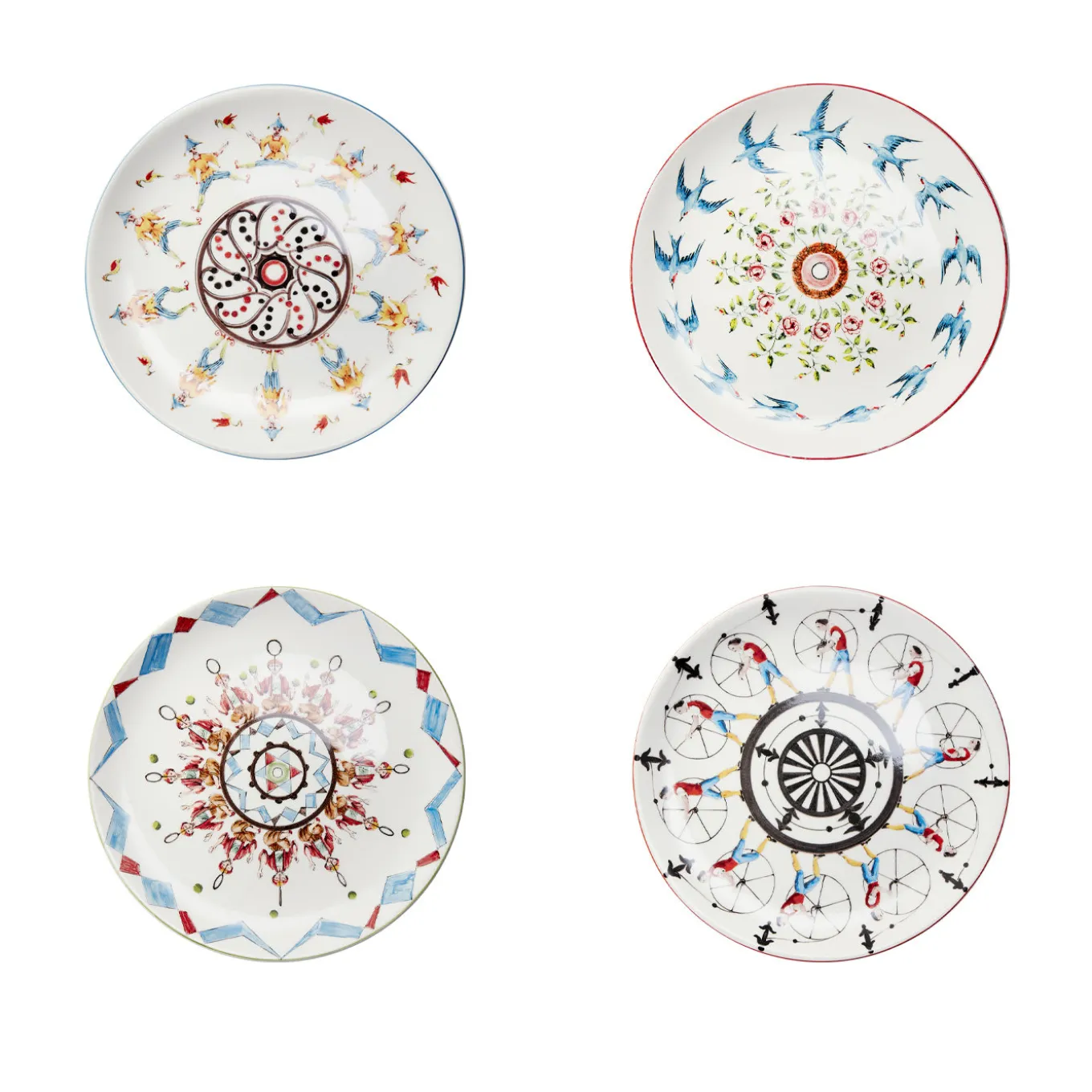 If the Lumière brothers imagined a Collection, it would most likely look something like this. The protagonists of these playful and colorful plates, shown at the 2016 Design Week, are just waiting to rotate around their center, as in an ancient zoetrope, to come to life. So, the swallow is getting ready to spread its wings, the horse is getting ready to leap over the obstacle, and the juggler is getting ready to finish his act.