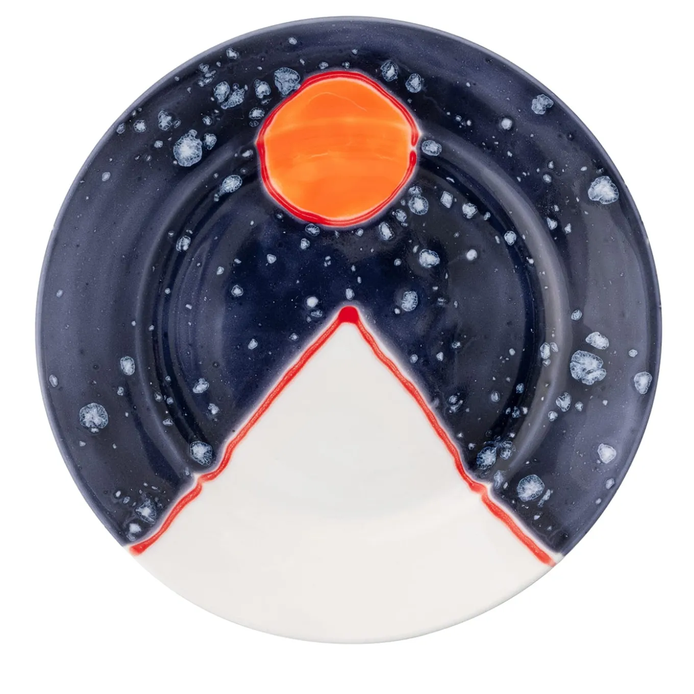 The Sierra Bread Plate captivates with its deep, mysterious design, featuring a starry, dark background that evokes a sense of wonder. The vibrant orange accents create a striking contrast, bringing warmth and energy to the plate. Central to the design is a classic mountain figure, a signature element in Coralla’s work, symbolizing strength and adventure. This unique combination of colors and imagery transforms each meal into an experience, making it perfect for both everyday dining and spe