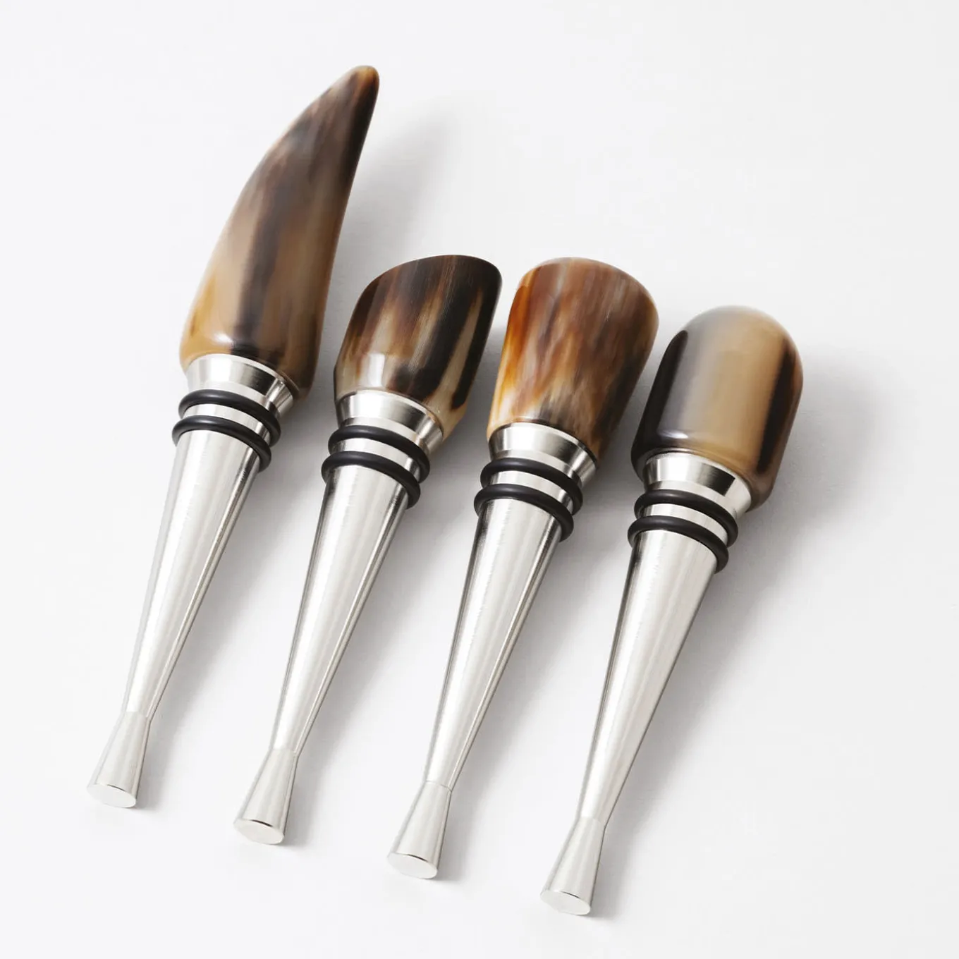 Elevate the art of wine enjoyment with the Set of 4 Wine Stoppers, each meticulously crafted with natural horn applications integrated into a robust stainless steel base. Ranging from 120 mm to 150 mm in size, these stoppers provide a secure seal for any bottle, ensuring the preservation of flavor and aroma. The unique beauty of the horn adds a touch of sophistication to any tabletop setting, making this set an ideal addition to home bar collections or as a thoughtful gift for wine enthusiasts. Part of the Apollo Collction.