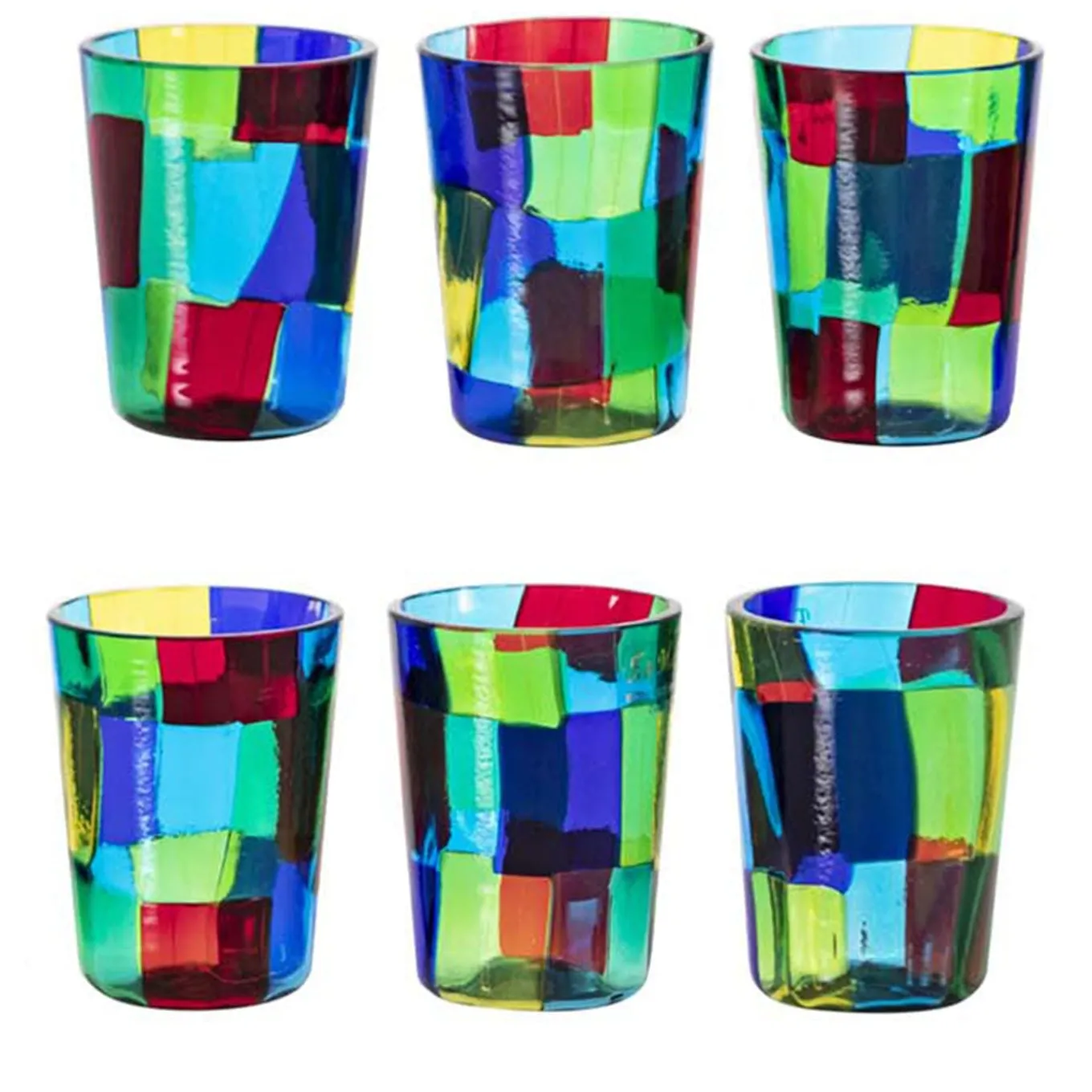 In this set master Angelo Ballarin handcrafted 6 shot glasses by matching together Murano glass tiles with different colors. Because of the predominance of blue, it recalls the colors of the sea, from which the name Acquamarina took inspiration. The colors that has been used are aquamarine, blue, yellow, green, red and orange.