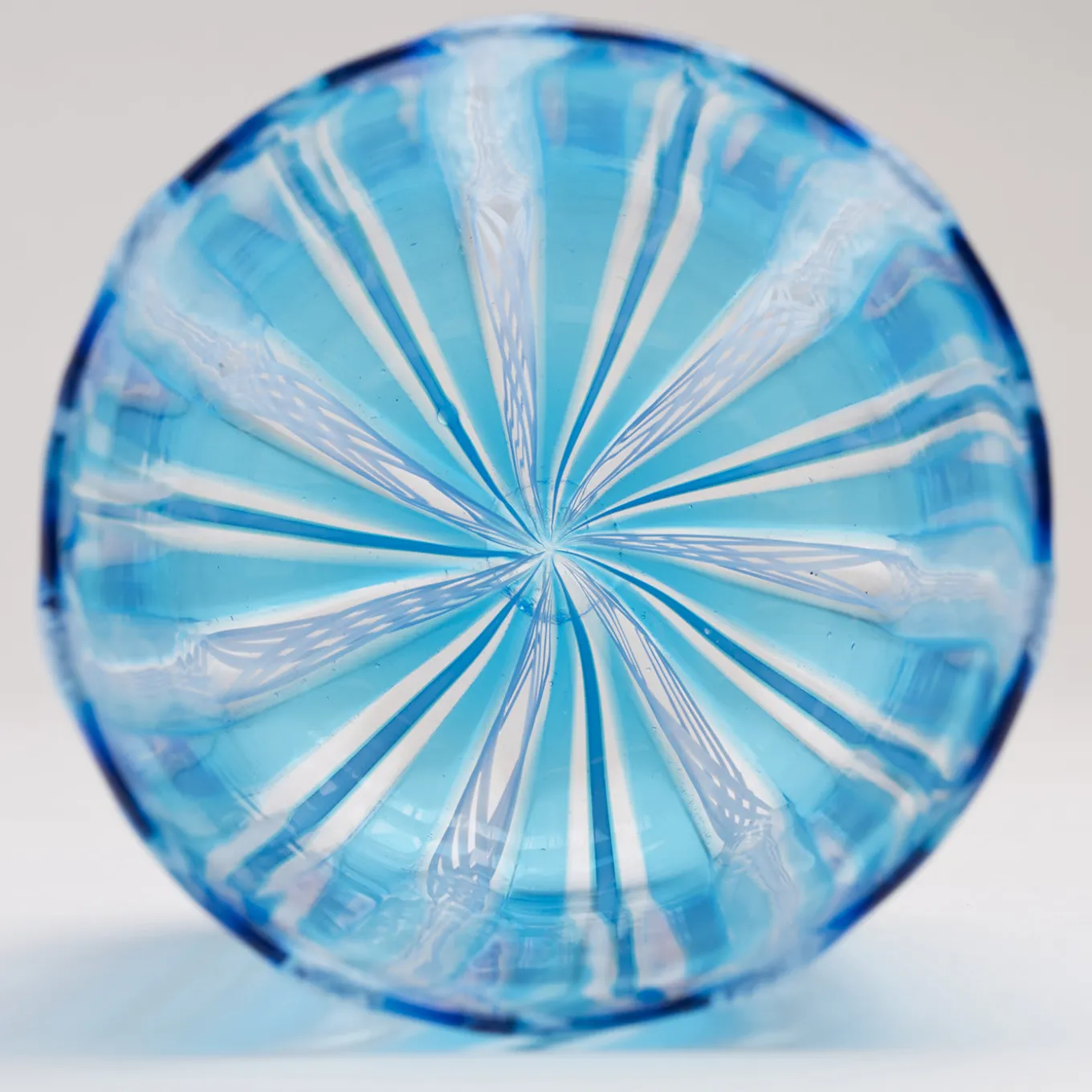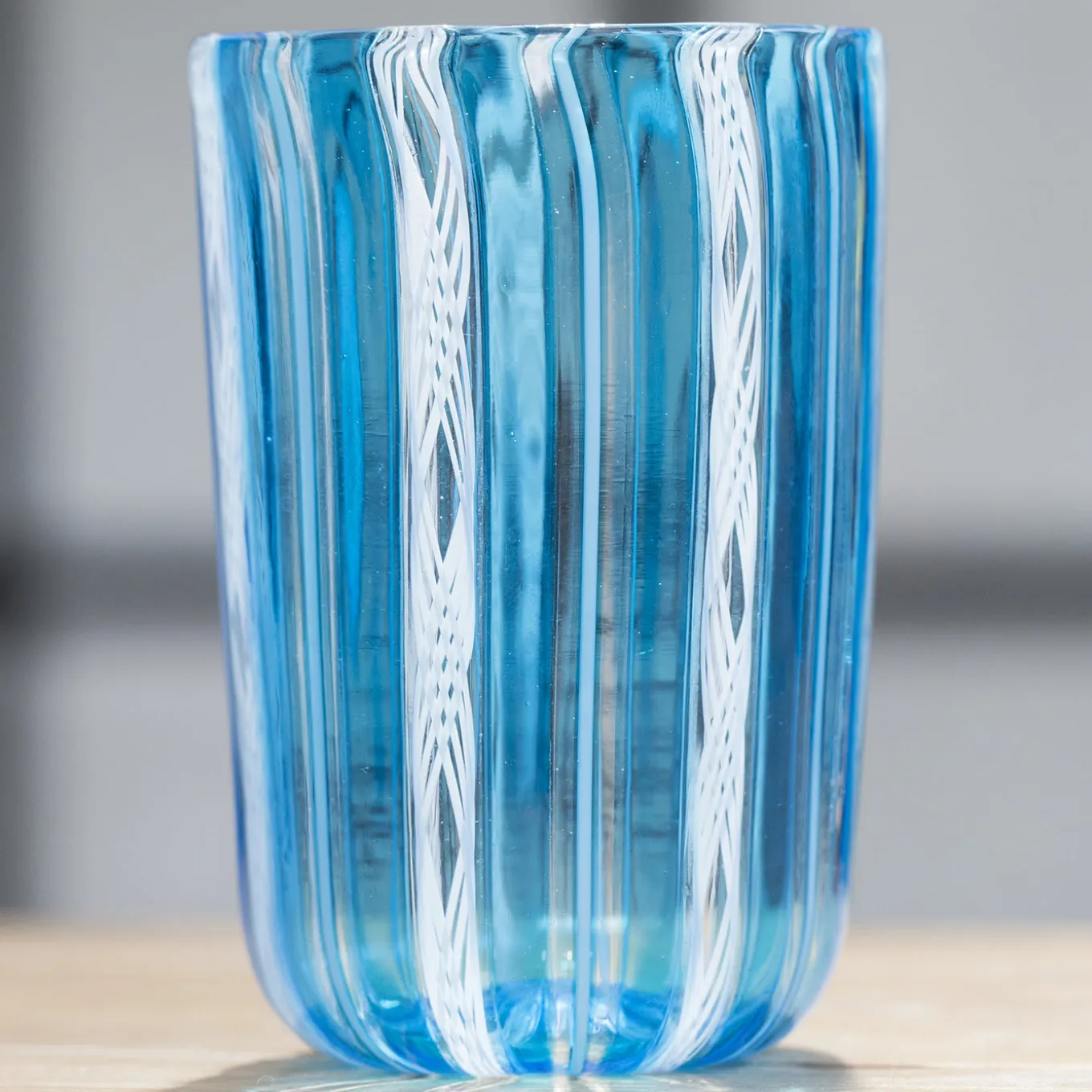 Set of 6 filigree Murano glasses made with the “a Canna” technique, where canes of colored glass are melted into a clear glass base. This beautiful blue set includes 6 glasses entirely handcrafted on the Venetian island of Murano by the master glass blowers of La Fornasotta. The filigree glasses are usually considered the most precious among all Murano glasses.