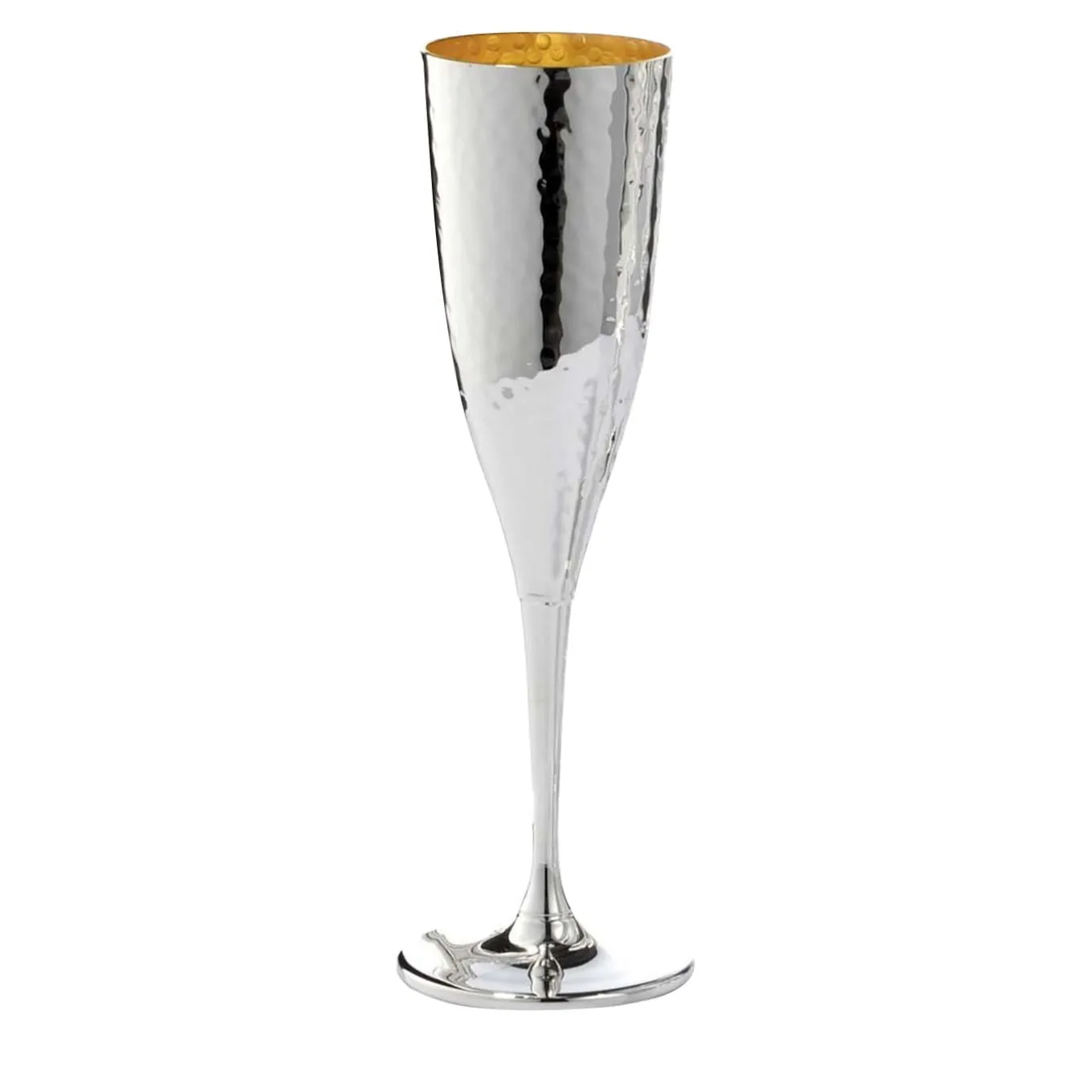 Designed to complement the wine decanters from the same series with a hand-hammered finish, this set of six flutes is silver-plated with an interior gold layer that adds a luxurious contrast of strong visual interest. A sophisticated and thoughtful gift to celebrate housewarmings or weddings, these flutes are specifically designed for red wine tasting as they keep wine at optimal temperature, enhancing the bouquet.