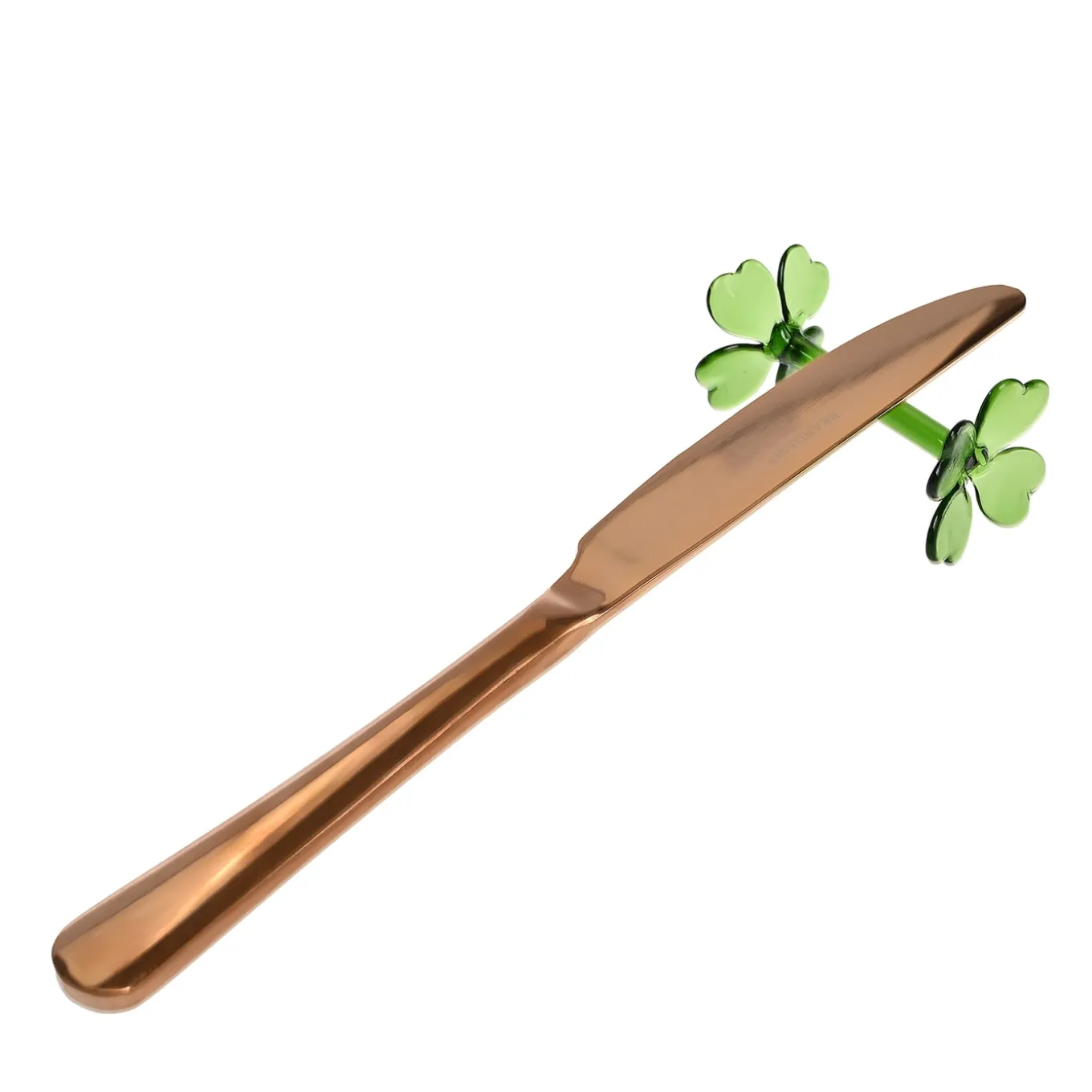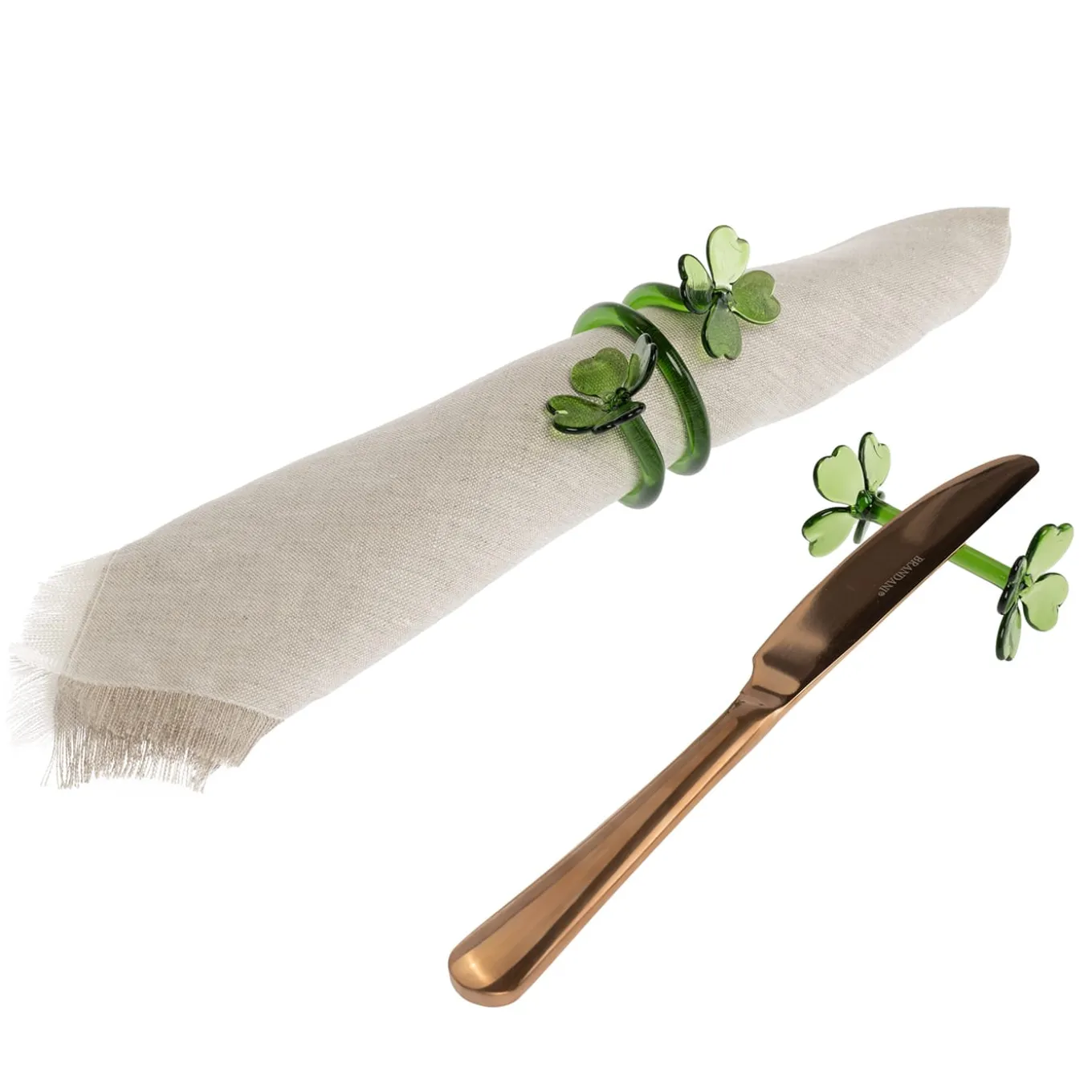 This set of 6 green Four leaf clover-shaped green knife holders represents a singular and sophisticated good omen present to offer luck and good vibes. Infusing a lively and original charm on a modern style setting, each knife holder is superbly distinguished by a refined smooth surface ending with a four-leaf clover shape. It is a colorful and playful touch that does not fail to be elegant and unique. Handcrafted in Venice, Italy.