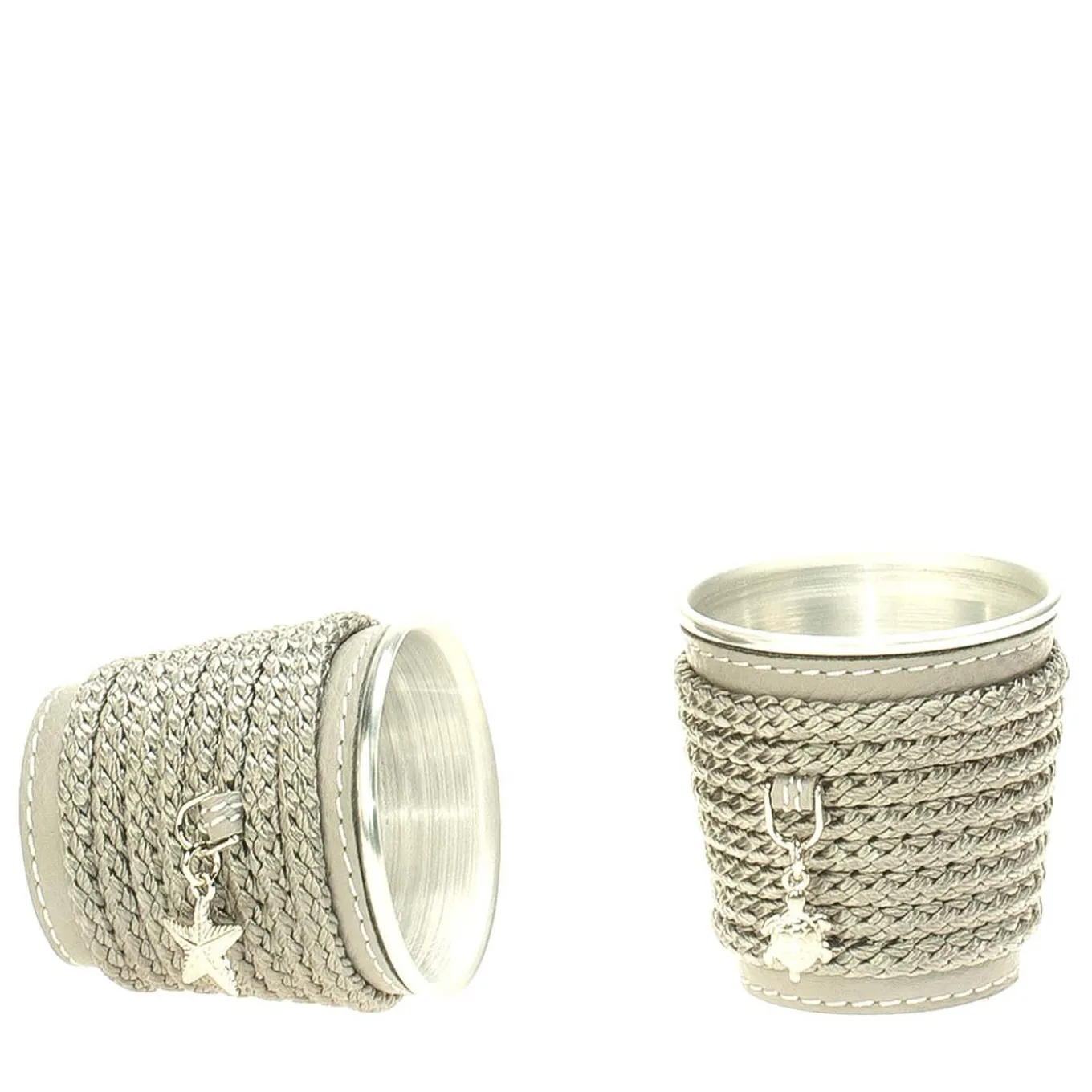 Charming and practical, these cup holders offer solutions to avoid wasting disposable plastic during parties. Made of metal with a white enamel finish, the exterior is decorated with a gray rope that adds an elegant color and textural contrast. The set includes six cup holders, each accented with a different charm in order to easily distinguish its owner. This is the perfect gift for a friend who likes entertaining.