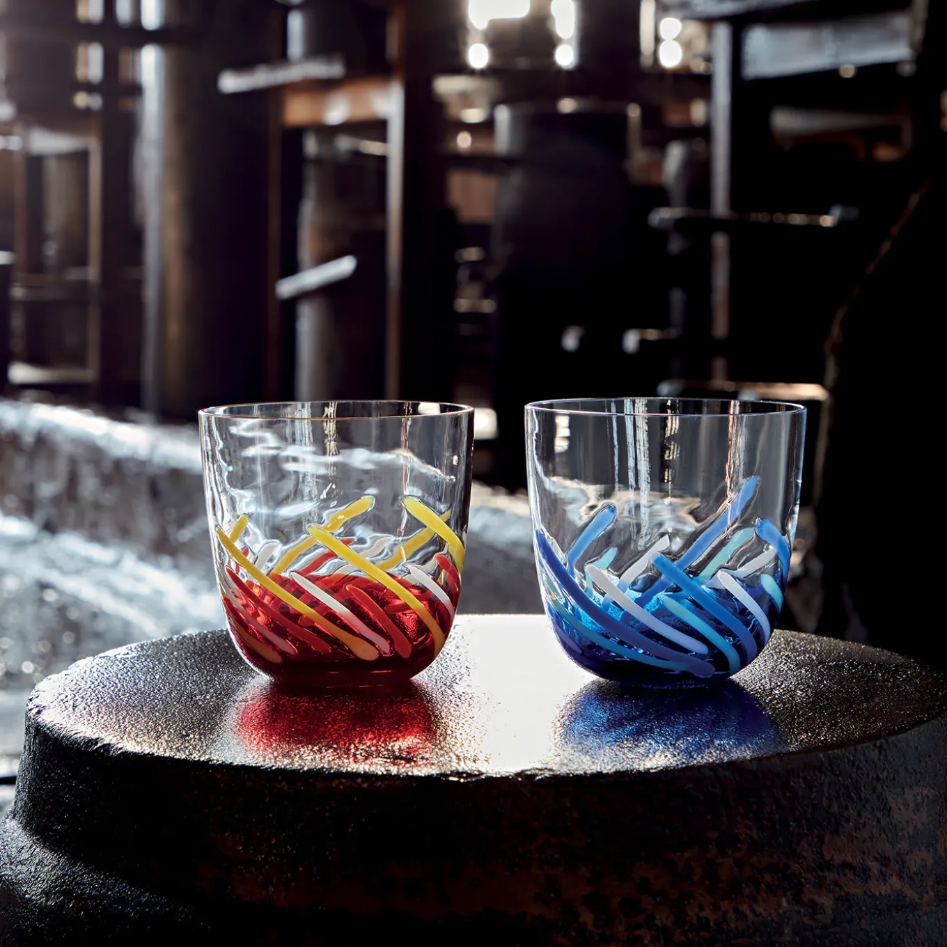The I Diversi 2020 Set of 6 Glasses is unique and individual in each piece. Blown expertly by mouth and finished by hand, the decorative motifs are applied using heat. For additional exclusivity, the glasses are also signed and dated. Featuring an exquisite shape and pure lines, they are decorated spectacularly with bold painted blue, aqua and white strips.