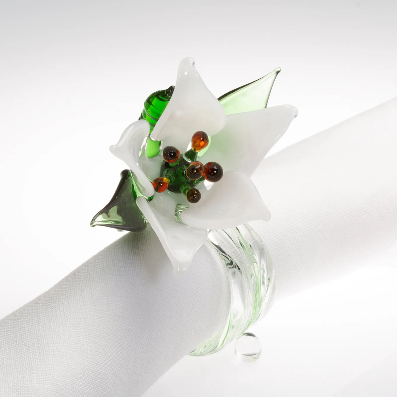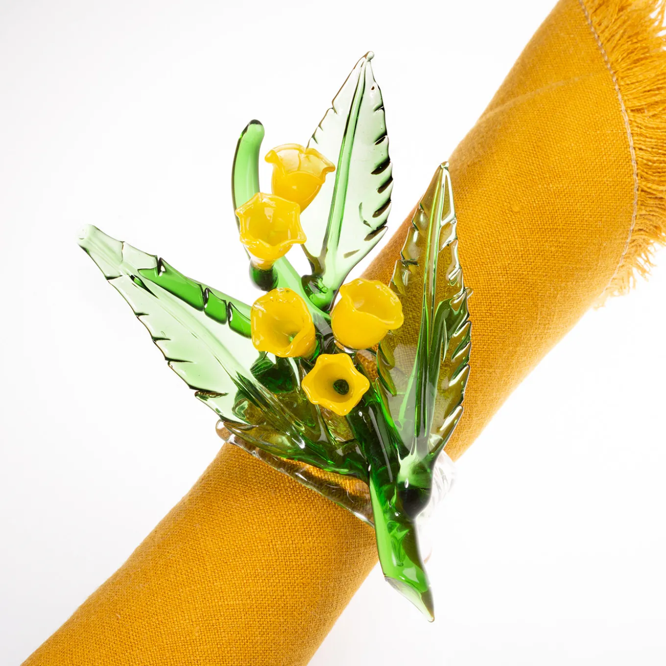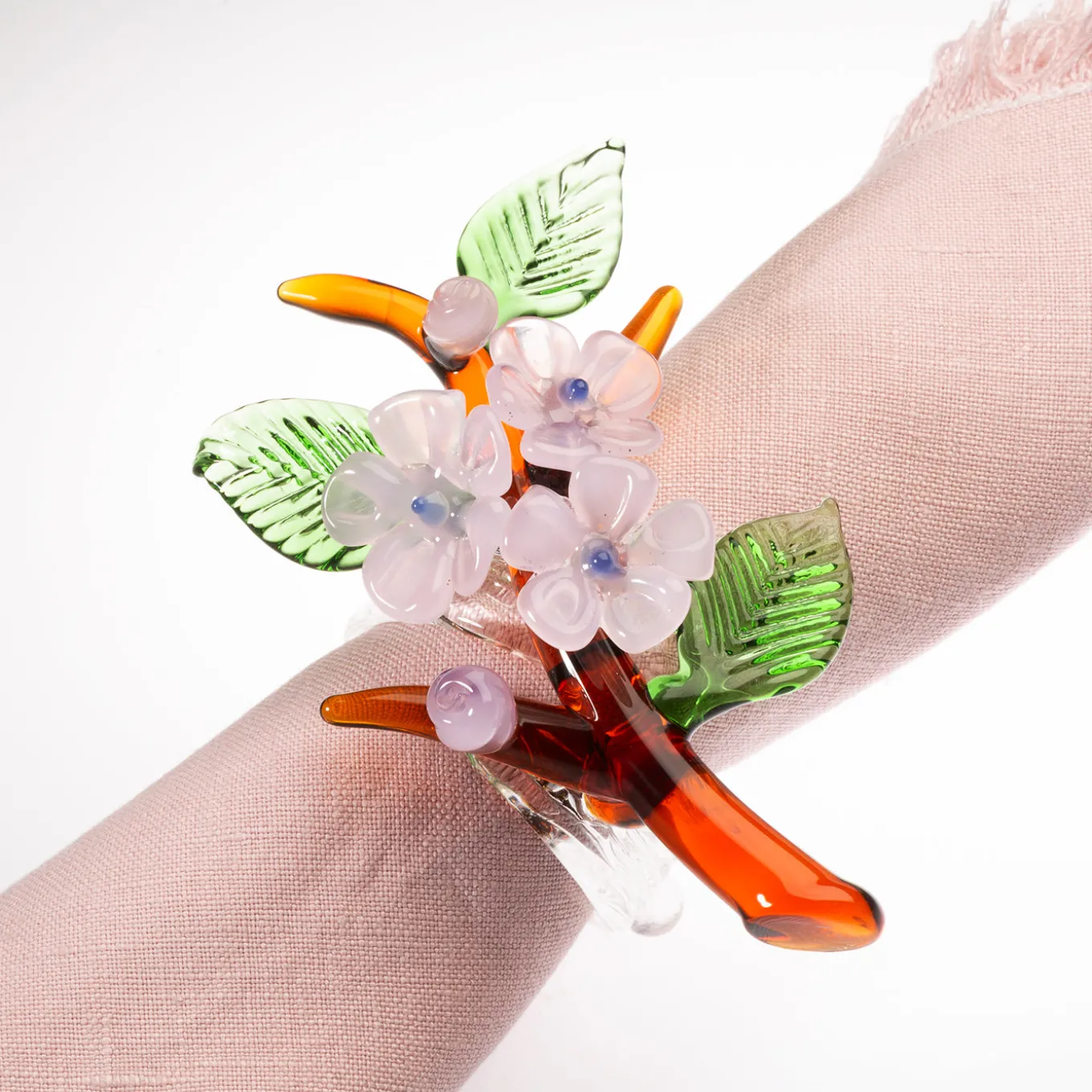 Set of six napkin rings featuring distinct floral designs including lily, poppy, pansy, cherry blossom, yellow bellflower, and wild blue flowers. Each ring is crafted with intricate colored borosilicate glass, showcasing detailed miniature sculptures with unique shapes and hues. Measuring approximately 8-10.5cm x 7-8cm, these pieces serve as elegant table accents. Dishwasher safe and carefully crafted with precision, they bring a refined garden-inspired aesthetic to any dining setting.