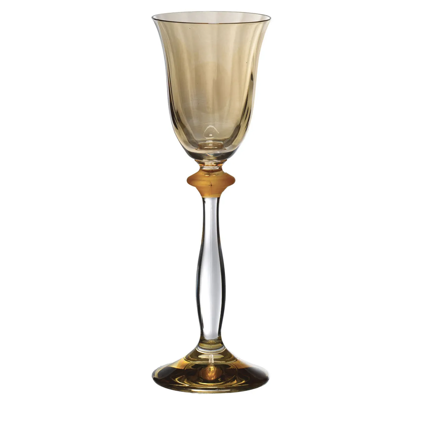 Set of 6 primula blown glass liquor glasses featuring a medium-sized bowl with a gently flared rim and a slender, elongated stem. Each glass is hand-decorated with subtle tonal variations in brown, creating a refined yet warm aesthetic. The combination of delicate craftsmanship and elegant form makes these glasses suitable for serving a variety of spirits in a sophisticated setting.