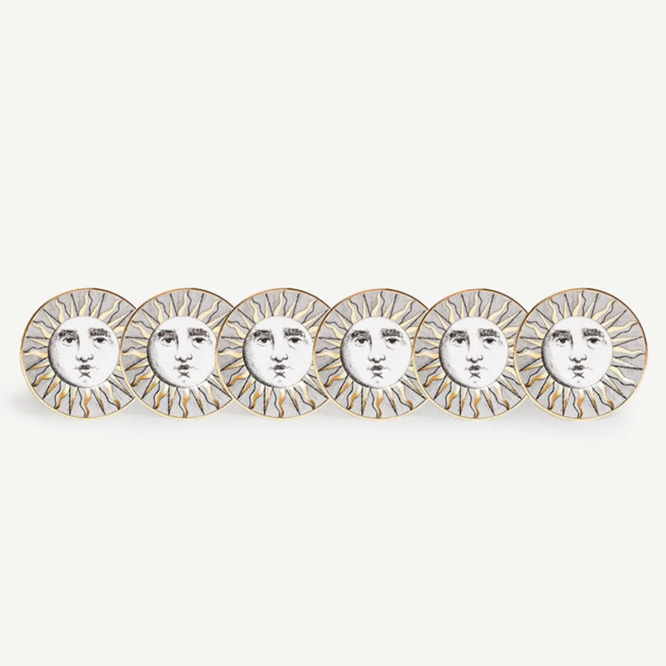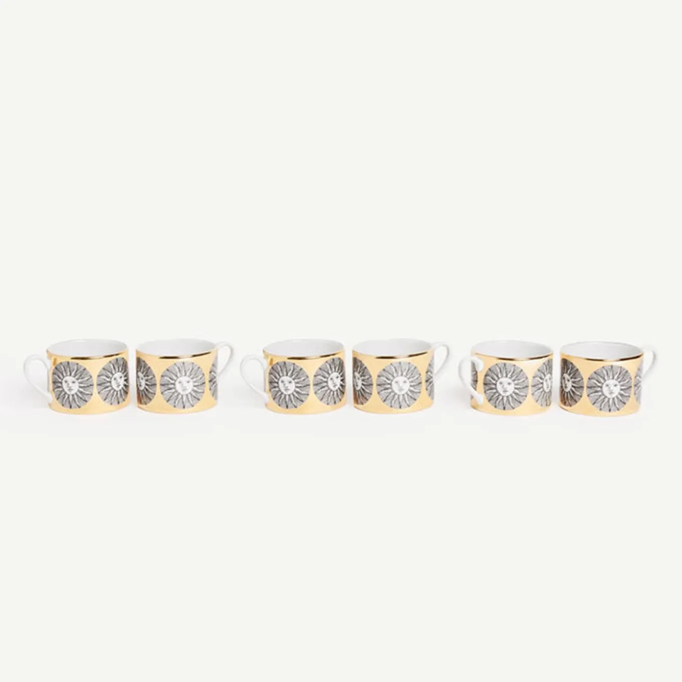 The sun occupies a privileged place in Fornasetti’s imagination and is one of the main decorative themes of the Atelier: here it is the protagonist of this set of hand-decorated porcelain tea cups with gold accents. Any minor discrepancies between similar creations are the result of craftsmanship and attest to the uniqueness of each product.