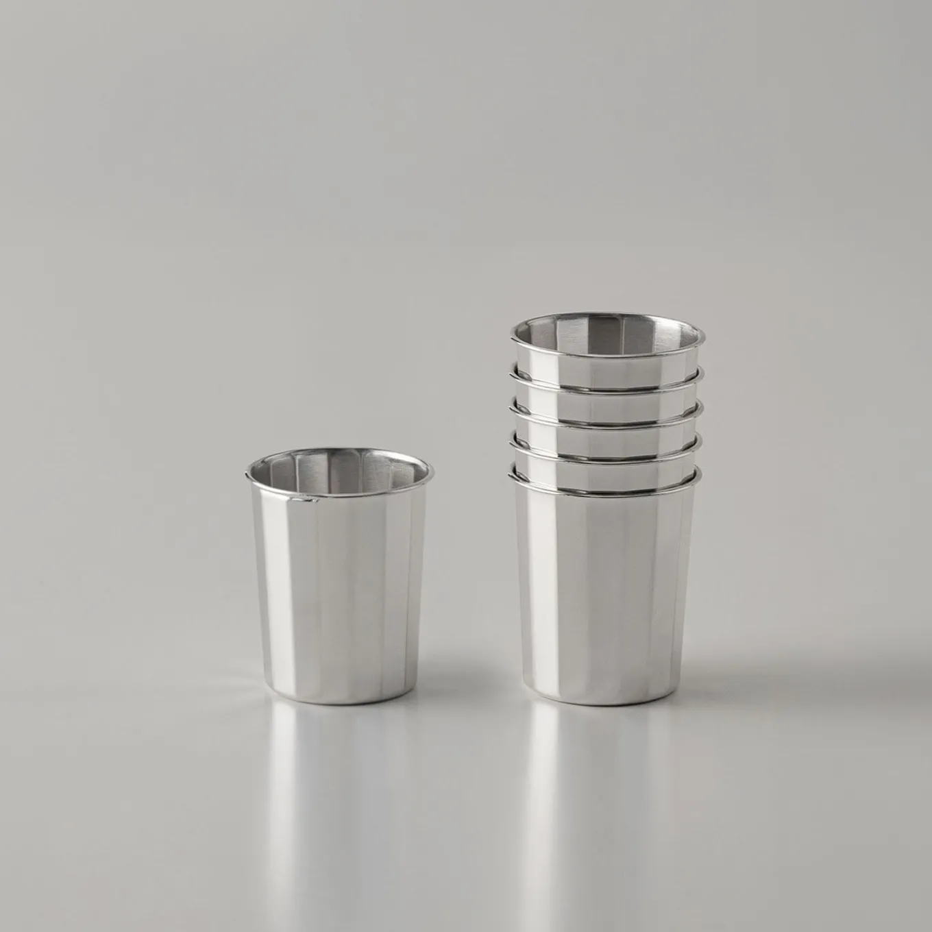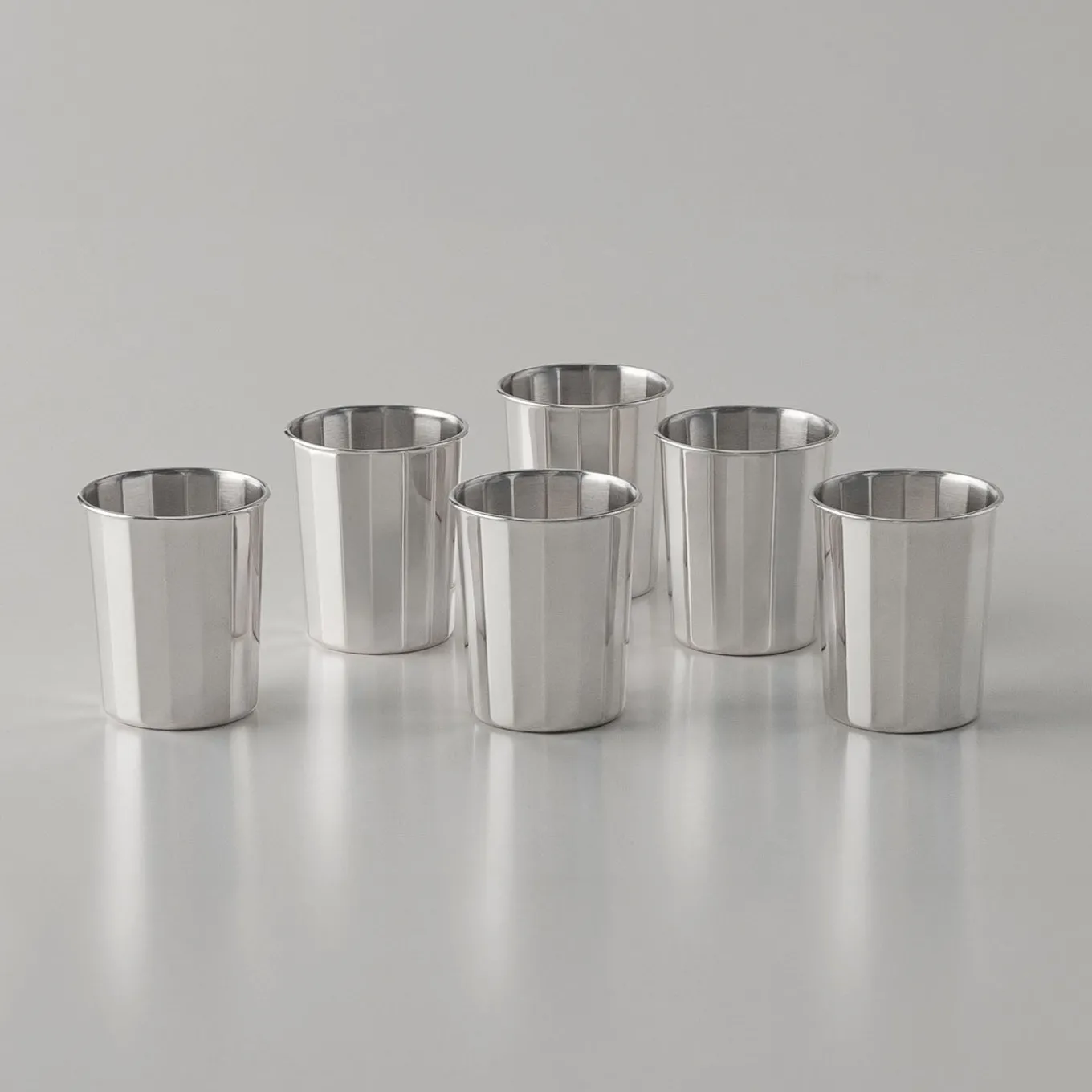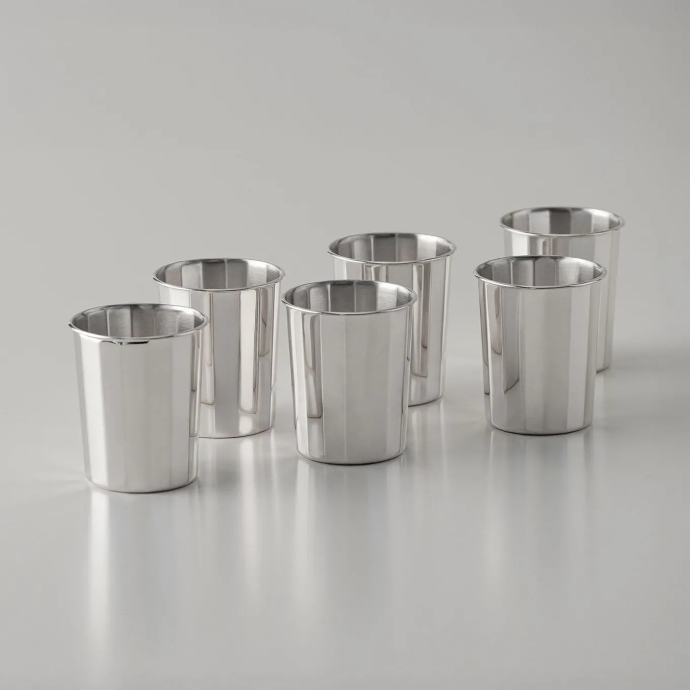This set of 6 sterling silver liquor glasses features a polygonal design with clean, sharp lines that highlight pure geometric form. The refined, minimalist style offers a sculptural elegance, ideal for those valuing understated sophistication and the classic allure of silver. Each piece reflects expert craftsmanship with a polished finish, combining contemporary design with timeless luxury.