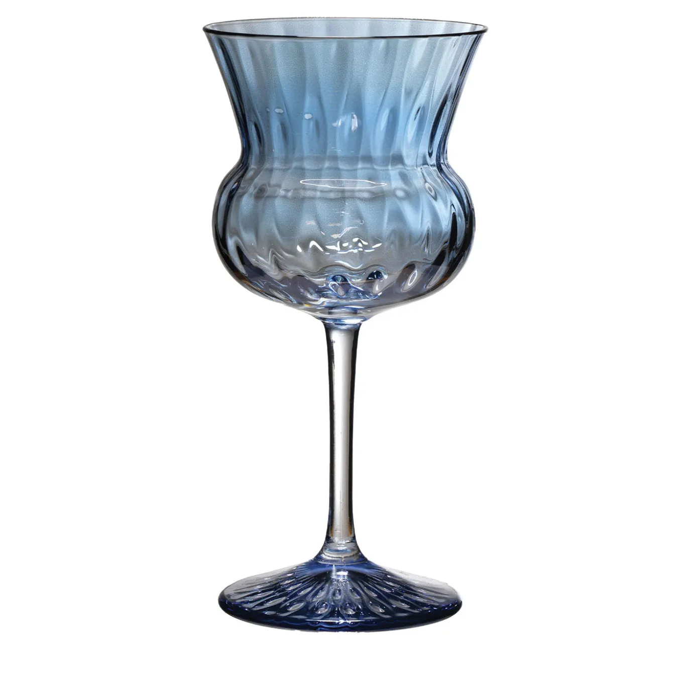Set of 6 tulipa cocktail glasses featuring a hand-decorated design with delicate texturing. Each medium-sized glass combines elegant curves with a finely detailed stem and base, enhancing the drinking experience and visual appeal. The blue tinted glass adds subtle color and sophistication, ideal for serving cocktails and spirits with style. The unique blowing technique provides a distinctive shape that blends functional form with artistic craftsmanship.